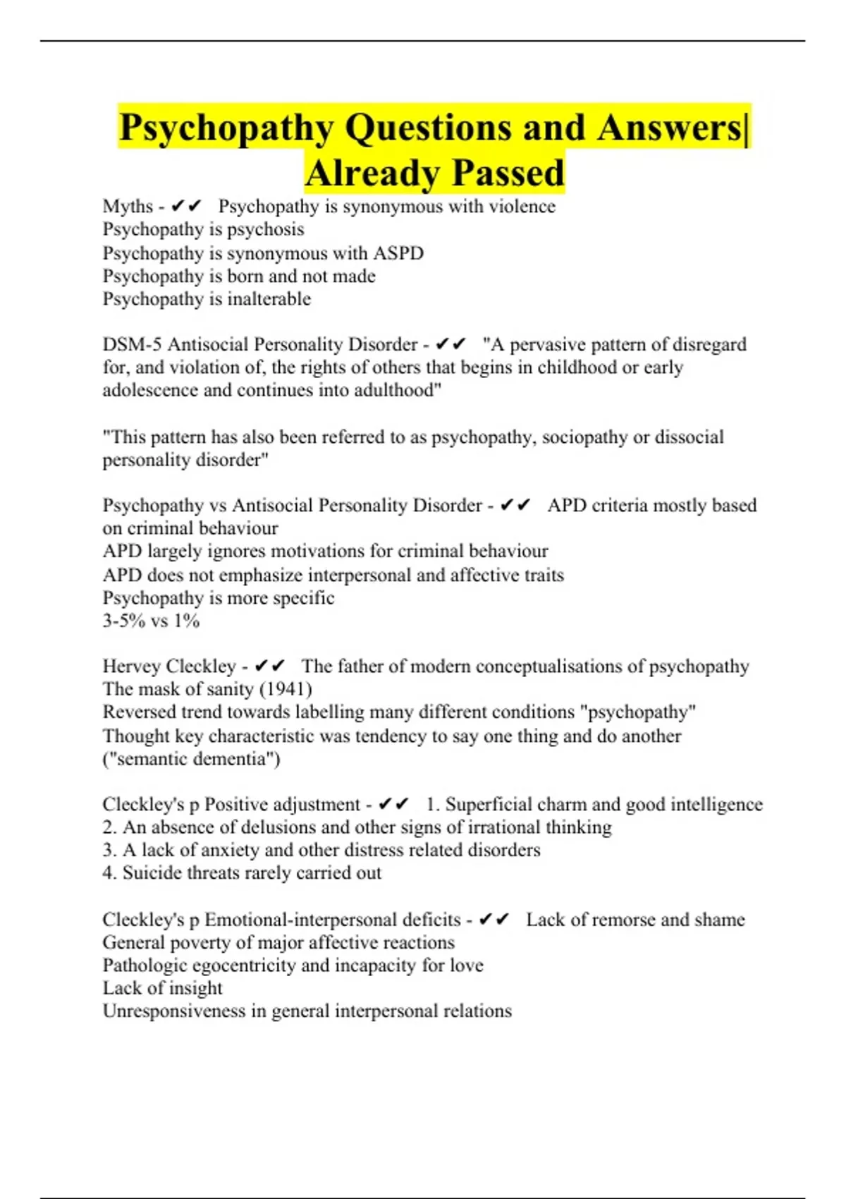 Myths - Psychopathy is synonymous with violence Psychopathy is psychosis Psychopathy is synonymous with ASPD Psychopathy is born and not made Psychopathy is inalterable DSM-5 Antisocial Personality Disorder - "A pervasive pattern of disregard for, and violation of, the rights of others that begins in childhood or early adolescence and continues into adulthood" "This pattern has also been referred to as psychopathy, sociopathy or dissocial personality disorder" Psychopathy vs Antisocial Personality Disorder - APD criteria mostly based on criminal behaviour APD largely ignores motivations for criminal behaviour APD does not emphasize interpersonal and affective traits Psychopathy is more specific 3-5% vs 1% Hervey Cleckley - The father of modern conceptualisations of psychopathy The mask of sanity (1941) Reversed trend towards labelling many different conditions "psychopathy" Thought key characteristic was tendency to say one thing and do another ("semantic dementia") Cleckley's p Positive adjustment - 1. Superficial charm and good intelligence 2. An absence of delusions and other signs of irrational thinking 3. A lack of anxiety and other distress related disorders 4. Suicide threats rarely carried out Cleckley's p Emotional-interpersonal deficits - Lack of remorse and shame General poverty of major affective reactions Pathologic egocentricity and incapacity for love Lack of insight Unresponsiveness in general interpersonal relations Cleckley's P Behavioural deviance - Unreliability Untruthfulness and insincerity Poorly motivated antisocial behaviour Poor judgement and failure to learn from experience Fantastic and uninviting behaviour with drink and sometimes without An impersonal, trivial and poorly integrated sex life A failure to follow life plans Hare's Psychopathy - Drew on Cleckley's ideas Cleckley's clinical profile too vague for reliable diagnosis Argues that some of Cleckley's features contradict each other The Psychopathy Checklist (PCL) - Psychometric Measurement Hare developed PCL in 1980 (22 items) Based on Cleckley's original descriptions revised 1985 (20 items) = PCL-R Scored by trained psychologist File ratings, interview with client Each item scored 0, 1 or 2 If total 30+/40 = "psychopath" PCL-R FACTOR 1: Interpersonal /affective items (personality) - 1 Superficial charm 2 Grandiose sense of self-worth 4 Pathological lying 5 Manipulative 6 Lack of remorse or guilt 7 No emotional depth 8 Callous 16 Failure to accept responsibility for own actions PCL-R FACTOR 2: Lifestyle, Antisocial items (behavioural) - 3 Need for stimulation/easily bored 9 Parasitic lifestyle 10 Poor behavioural controls 12 Early behaviour problems 13 Lack of realistic long-term goals 14 Impulsivity 15 Irresponsibility 18 Juvenile delinquency 19 Probation, parole or other conditional release violation 20 Criminal versatility Non Factorial - 11 Promiscuous sexual behaviour 17 Many short-term marital relationships Correlates PCL-R of F1 and F2 - PCL-R F1 is positively associated with narcissism, low empathy, social dominance, and negatively associated with negative emotionality (e.g. depression) PCL-R F2 is associated with impulsivity, drug problems, early criminal behaviour and aggression.