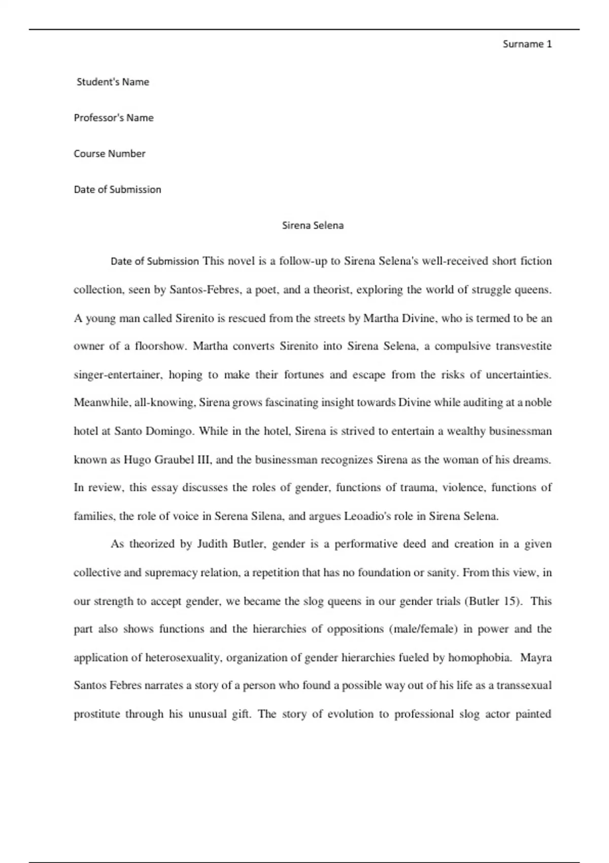 Sirena Selena Date of Submission This novel is a follow-up to Sirena Selena's well-received short fiction collection, seen by Santos-Febres, a poet, and a theorist, exploring the world of struggle queens. A young man called Sirenito is rescued from the streets by Martha Divine, who is termed to be an owner of a floorshow. Martha converts Sirenito into Sirena Selena, a compulsive transvestite singer-entertainer, hoping to make their fortunes and escape from the risks of uncertainties. Meanwhile, all-knowing, Sirena grows fascinating insight towards Divine while auditing at a noble hotel at Santo Domingo. While in the hotel, Sirena is strived to entertain a wealthy businessman known as Hugo Graubel III, and the businessman recognizes Sirena as the woman of his dreams. In review, this essay discusses the roles of gender, functions of trauma, violence, functions of families, the role of voice in Sirena Selena, and argues Leoadio's role in Sirena Selena.
