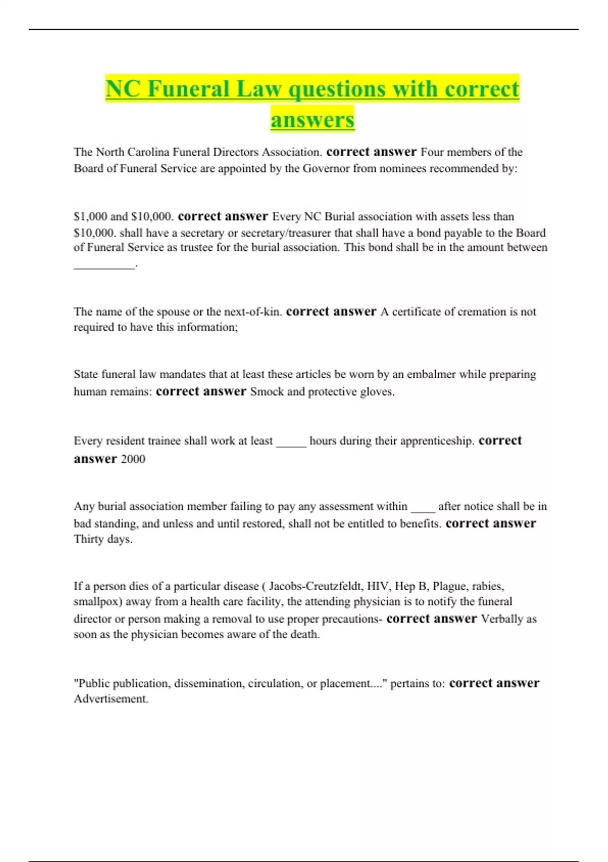 The North Carolina Funeral Directors Association. correct answer Four members of the Board of Funeral Service are appointed by the Governor from nominees recommended by: $1,000 and $10,000. correct answer Every NC Burial association with assets less than $10,000. shall have a secretary or secretary/treasurer that shall have a bond payable to the Board of Funeral Service as trustee for the burial association. This bond shall be in the amount between __________. The name of the spouse or the next-of-kin. correct answer A certificate of cremation is not required to have this information; State funeral law mandates that at least these articles be worn by an embalmer while preparing human remains: correct answer Smock and protective gloves. Every resident trainee shall work at least _____ hours during their apprenticeship. correct answer 2000 Any burial association member failing to pay any assessment within ____ after notice shall be in bad standing, and unless and until restored, shall not be entitled to benefits. correct answer Thirty days.
