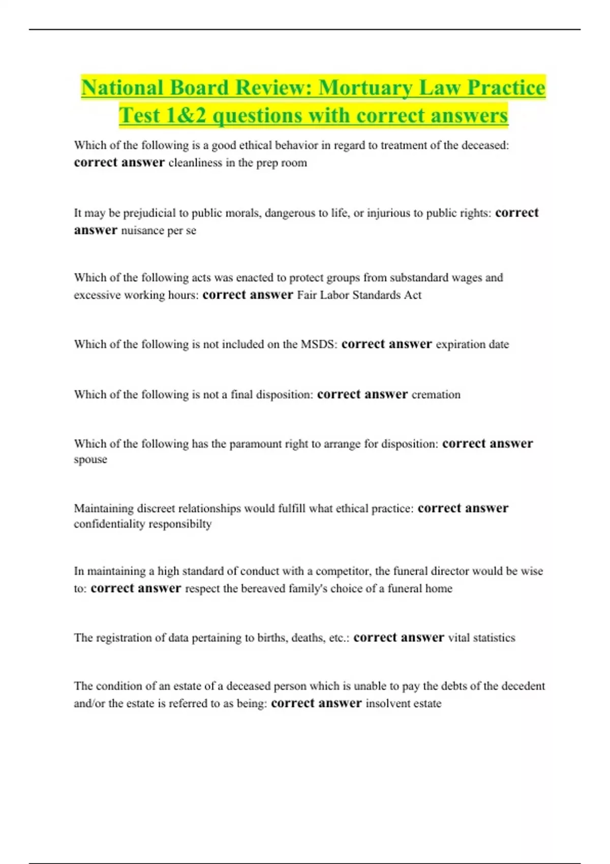 National Board Review: Mortuary Law Practice Test 1&2 questions with correct answers