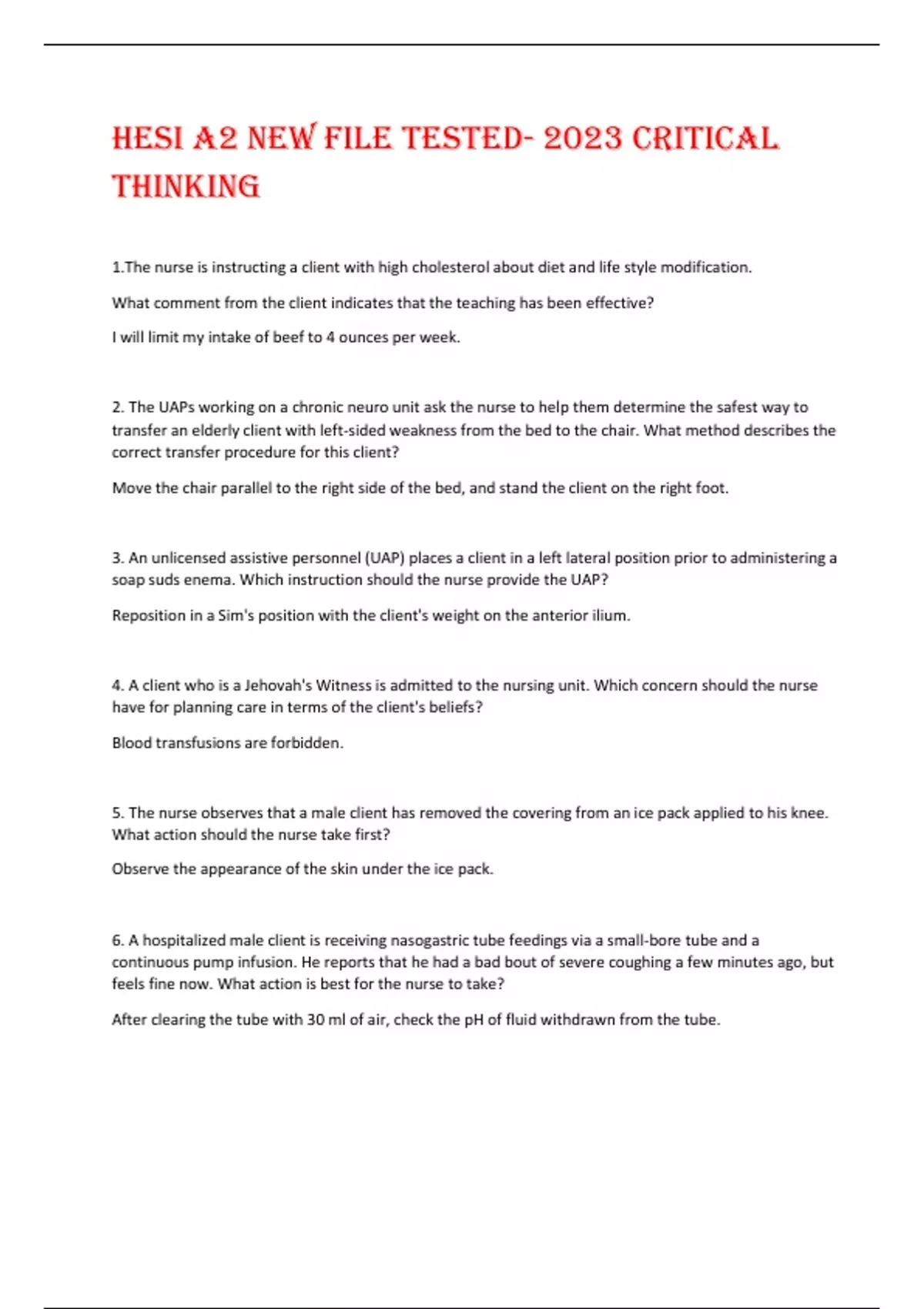 HESI A2 NEW FILE TESTED- 2023 CRITICAL THINKING 1.The nurse is instructing a client with high cholesterol about diet and life style modification. What comment from the client indicates that the teaching has been effective? I will limit my intake of beef to 4 ounces per week. 2. The UAPs working on a chronic neuro unit ask the nurse to help them determine the safest way to transfer an elderly client with left-sided weakness from the bed to the chair. What method describes the correct transfer procedure for this client? Move the chair parallel to the right side of the bed, and stand the client on the right foot. 3. An unlicensed assistive personnel (UAP) places a client in a left lateral position prior to administering a soap suds enema. Which instruction should the nurse provide the UAP? Reposition in a Sim's position with the client's weight on the anterior ilium. 4. A client who is a Jehovah's Witness is admitted to the nursing unit. Which concern should the nurse have for planning care in terms of the client's beliefs? Blood transfusions are forbidden. 5. The nurse observes that a male client has removed the covering from an ice pack applied to his knee. What action should the nurse take first? Observe the appearance of the skin under the ice pack. 6. A hospitalized male client is receiving nasogastric tube feedings via a small-bore tube and a continuous pump infusion. He reports that he had a bad bout of severe coughing a few minutes ago, but feels fine now. What action is best for the nurse to take? After clearing the tube with 30 ml of air, check the pH of fluid withdrawn from the tube. 7. A male client being discharged with a prescription for the bronchodilator theophylline tells the nurse that he understands he is to take three doses of the medication each day. Since, at the time of discharge, timed-release capsules are not available, which dosing schedule should the nurse advise the client to follow? 8 a.m., 4 p.m., and midnight. 8. A client is to receive 10 mEq of KCl diluted in 250 ml of normal saline over 4 hours. At what rate should the nurse set the client's intravenous infusion pump? To calculate this problem correctly, remember that the dose of KCl is not used in the calculation. 250 ml/4 hours = 63 ml/hour. 9. An obese male client discusses with the nurse his plans to begin a long-term weight loss regimen. In addition to dietary changes, he plans to begin an intensive aerobic exercise program 3 to 4 times a week and to take stress management classes. After praising the client for his decision, which instruction is most important for the nurse to provide? Be sure to have a complete physical examination before beginning your planned exercise program. 10. The nurse is teaching a client proper use of an inhaler. When should the client administer the inhaler-delivered medication to demonstrate correct use of the inhaler? During the inhalation. 11. Which action is most important for the nurse to implement when donning sterile gloves? Keep gloved hands above the elbows. 12. A client with chronic renal failure selects a scrambled egg for his breakfast. What action should the nurse take? Commend the client for selecting a high biologic value protein. 13. A client who is 5' 5" tall and weighs 200 pounds is scheduled for surgery the next day. What question is most important for the nurse to include during the preoperative assessment? What vitamin and mineral supplements do you take? 14. During the initial morning assessment, a male client denies dysuria but reports that his urine appears dark amber. Which intervention should the nurse implement? Encourage additional oral intake of juices and water. 15. Which intervention is most important for the nurse to implement for a male client who is experiencing urinary retention? Assess for bladder distention. 16. The nurse assigns a UAP to obtain vital signs from a very anxious client. What instructions should the nurse give the UAP? Report the results of the vital signs to the nurse. 17. An adult male client with a history of hypertension tells the nurse that he is tired of taking antihypertensive medications and is going to try spiritual meditation instead. What should be the nurse's first response? It is important that you continue your medication while learning to meditate. 18. The nurse is completing a mental assessment for a client who is demonstrating slow thought processes, personality changes, and emotional lability. Which area of the brain controls these neuro-- cognitive functions? Frontal lobe. 19. A male client tells the nurse that he does not know where he is or what year it is. What data should the nurse document that is most accurate? is disoriented to place and time. 20. An African-American grandmother tells the nurse that her 4-year-old grandson is suffering with "miseries." Based on this statement, which focused assessment should the nurse conduct? Inquire about the source and type of pain. 21. The nurse notices that the Hispanic parents of a toddler who returns from surgery offer the child only the broth that comes on the clear liquid tray. Other liquids, including gelatin, popsicles, and juices, remain untouched. What explanation is most appropriate for this behavior? Hot remedies restore balance after surgery, which is considered a "cold" condition. 22. During a physical assessment, a female client begins to cry. Which action is best for the nurse to take? Acknowledge the client's distress and tell her it is all right to cry. 23. A female client asks the nurse to find someone who can translate into her native language her concerns about a treatment. Which action should the nurse take? Request and document the name of the certified translator. 24. The nurse is teaching a client with numerous allergies how to avoid allergens. Which instruction should be included in this teaching plan? Avoid any types of sprays, powders, and perfumes 25. The Patient: A 54-year-old male who weighs 275 pounds. He is 5’ 10” tall and has 