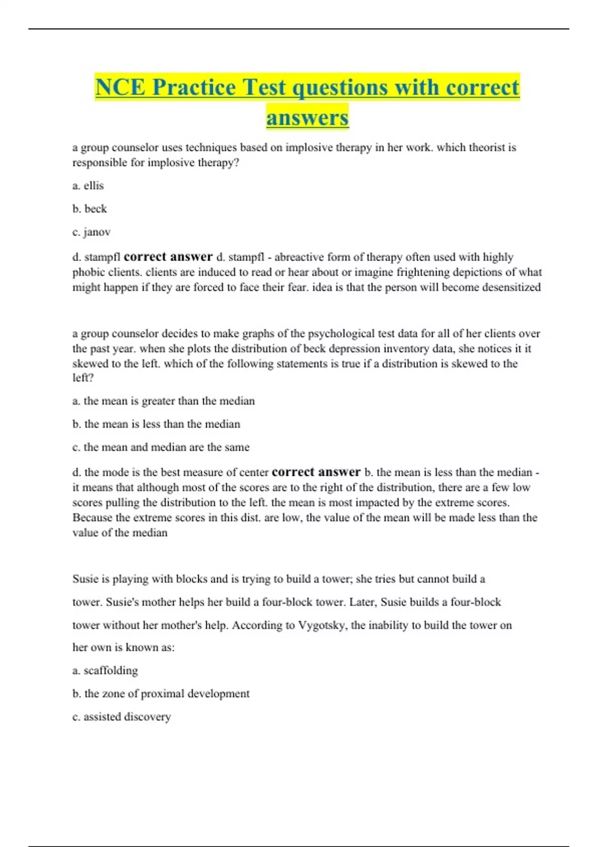 a group counselor uses techniques based on implosive therapy in her work. which theorist is responsible for implosive therapy? a. ellis b. beck c. janov d. stampfl correct answer d. stampfl - abreactive form of therapy often used with highly phobic clients. clients are induced to read or hear about or imagine frightening depictions of what might happen if they are forced to face their fear. idea is that the person will become desensitized a group counselor decides to make graphs of the psychological test data for all of her clients over the past year. when she plots the distribution of beck depression inventory data, she notices it it skewed to the left. which of the following statements is true if a distribution is skewed to the left? a. the mean is greater than the median b. the mean is less than the median c. the mean and median are the same d. the mode is the best measure of center correct answer b. the mean is less than the median - it means that although most of the scores are to the right of the distribution, there are a few low scores pulling the distribution to the left. the mean is most impacted by the extreme scores. Because the extreme scores in this dist. are low, the value of the mean will be made less than the value of the median Susie is playing with blocks and is trying to build a tower; she tries but cannot build a tower. Susie's mother helps her build a four-block tower. Later, Susie builds a four-block tower without her mother's help. According to Vygotsky, the inability to build the tower on her own is known as: a. scaffolding b. the zone of proximal development c. assisted discovery
