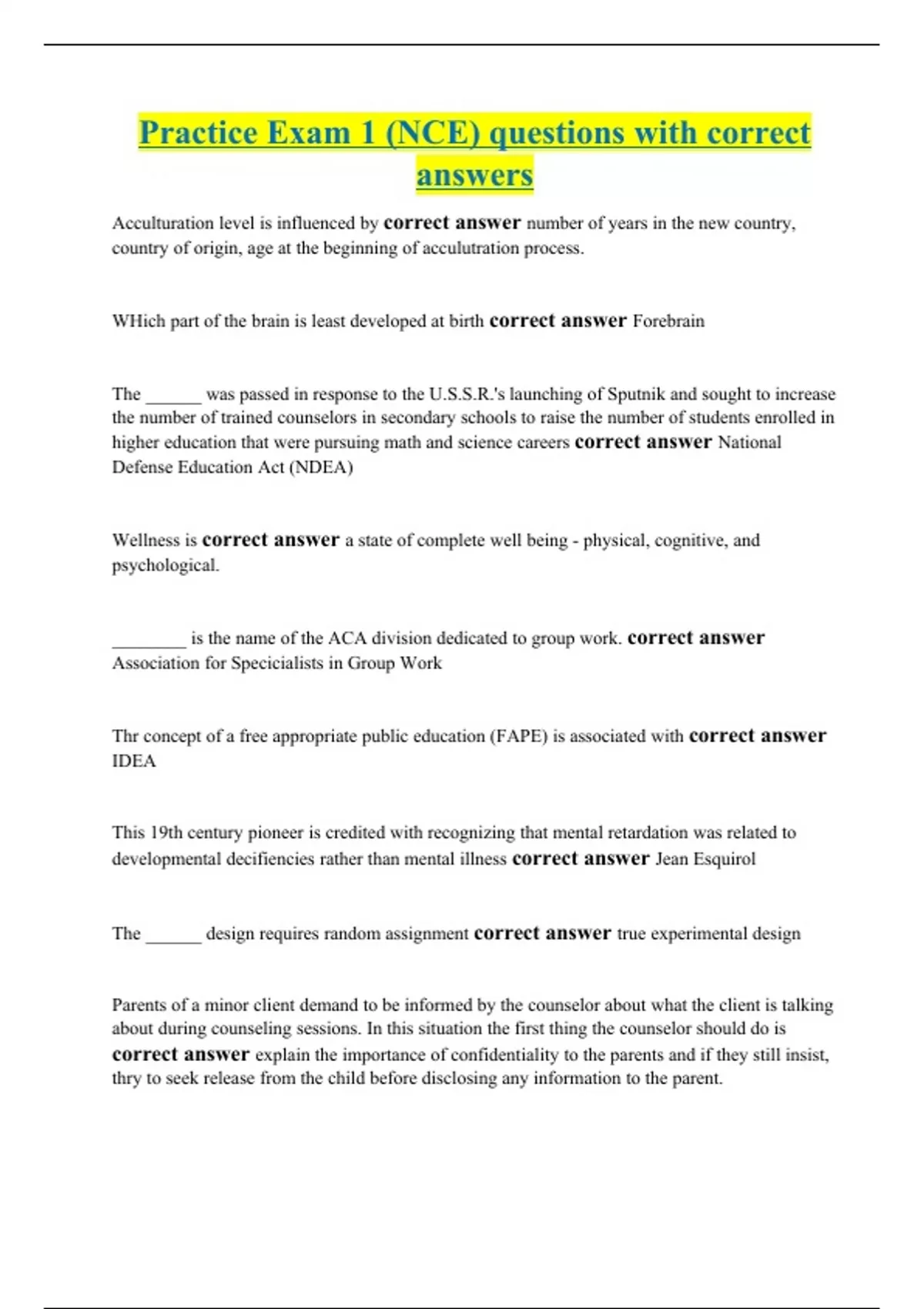 To become a National Certified Counselor (NCC), individuals musst have correct answer passed the NCE, achieved an advanced degree in counseling, met the requirements for supervised experience According to Albert Bandura, each of the following is a characteristic of an effective model. correct answer percieved as having high status, perceived as competent, and perceived as warm and friendly.