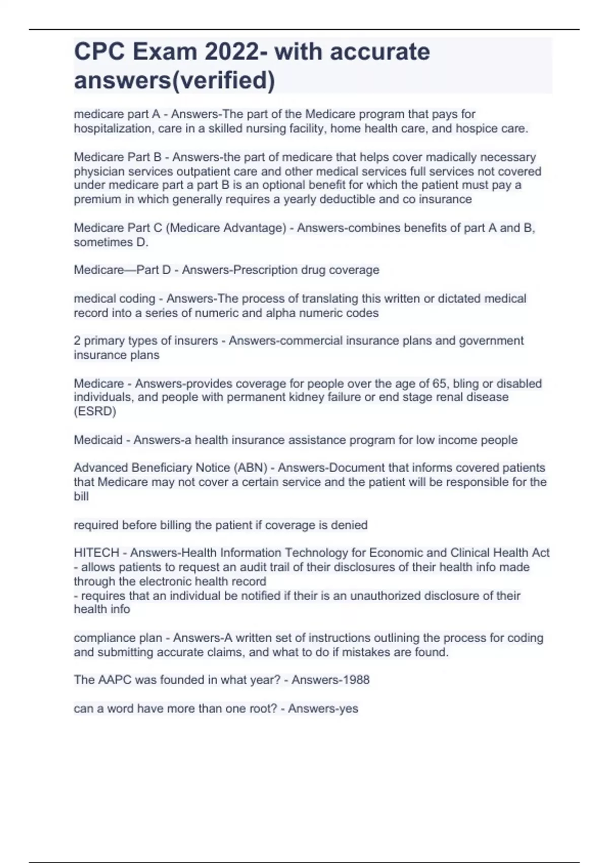 Advanced Beneficiary Notice (ABN) - Answers-Document that informs covered patients that Medicare may not cover a certain service and the patient will be responsible for the bill required before billing the patient if coverage is denied HITECH - Answers-Health Information Technology for Economic and Clinical Health Act - allows patients to request an audit trail of their disclosures of their health info made through the electronic health record - requires that an individual be notified if their is an unauthorized disclosure of their health info compliance plan - Answers-A written set of instructions outlining the process for coding and submitting accurate claims, and what to do if mistakes are found. The AAPC was founded in what year? - Answers-1988 can a word have more than one root? - Answers-yes