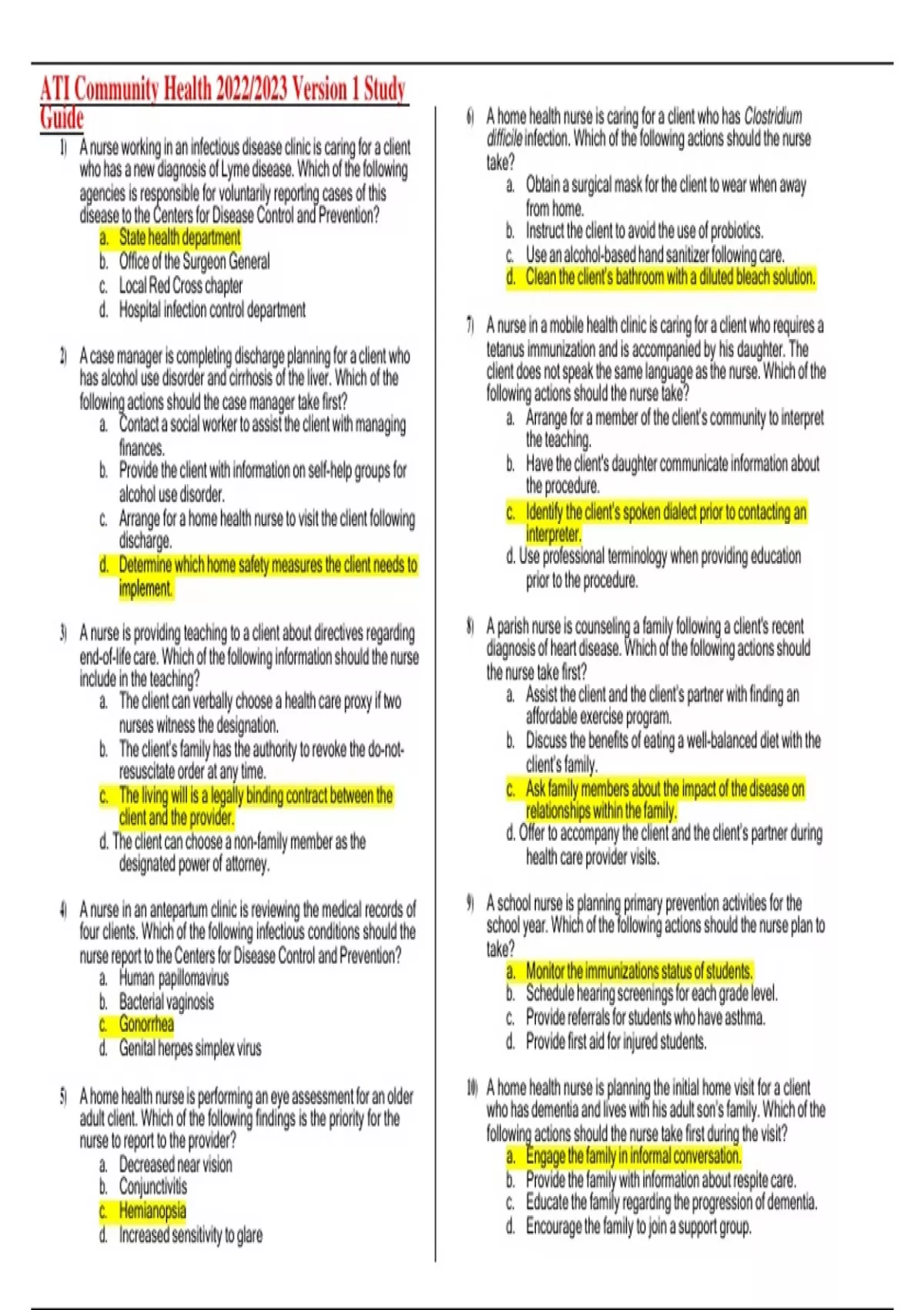 1. Which information is a priority for the RN to reinforce to an older client after intravenous pylegraphy? A) Eat a light diet for the rest of the day B) Rest for the next 24 hours since the preparation and the test is tiring. C) During waking hours drink at least 1 8-ounce glass of fluid every hour for the next 2 days D) Measure the urine output for the next day and immediately notify the health care provider if it should decrease. The correct answer is D: Measure the urine output for the next day and immediately notify the health care provider if it should decrease. 2. A client has altered renal function and is being treated at home. The nurse recognizes that the most accurate indicator of fluid balance during the weekly visits is A) difference in the intake and output B) changes in the mucous membranes C) skin turgor D) weekly weight The correct answer is D: weekly weight 3. A client has been diagnosed with Zollinger-Ellison syndrome.Which information is most important for the nurse to reinforce with the client? A) It is a condition in which one or more tumors called gastrinomas form in the pancreas or in the upper part of the small intestine (duodenum) B) It is critical to report promptly to your health care provider any findings of peptic ulcers c) Treatment consists of medications to reduce acid and heal any peptic ulcers and, if possible, surgery to remove any tumors D) With the average age at diagnosis at 50 years the peptic ulcers may occur at unusual areas of the stomach or intestine The correct answer is B: It is critical to report promptly to your health care provider any findings of peptic ulcers. 4. A primigravida in the third trimester is hospitalized for preeclampsia. The nurse determines that the client’s blood pressure is increasing. Which action should the nurse take first? A) Check the protein level in urine B) Have the client turn to the left side C) Take the temperature D) Monitor the urine output The correct answer is B: Have the client turn to the left side 5. The nurse is caring for a client in atrial fibrillation. The atrial heart rate is 250 and the ventricular rate is controlled at 75. Which of the following findings is cause for the most concern? A) Diminished bowel sounds B) Loss of appetite C) A cold, pale lower leg D) Tachypnea The correct answer is C: A cold, pale lower leg 6. The client with infective endocarditis must be assessed frequently by the home health nurse. Which finding suggests that antibiotic therapy is not effective, and must be reported by the nurse immediately to the healthcare provider? A) Nausea and vomiting B) Fever of 103 degrees Fahrenheit (39.5 degrees Celsius) C) Diffuse macular rash D) Muscle tenderness The correct answer is B: Fever of 103 degrees F (39.5 degrees C) 7. A client who had a vasectomy is in the post recovery unit at an outpatient clinic. Which of these points is most important to be reinforced by the nurse? A) Until the health care provider has determined that your ejaculate doesn't contain sperm, continue to use another form of contraception. B) This procedure doesn't impede the production of male hormones or the production of sperm in the testicles. The sperm can no longer enter your semen and no sperm are in your ejaculate. C) After your vasectomy, strenuous activity needs to be avoided for at least 48 hours. If your work doesn't involve hard physical labor, you can return to your job as soon as you feel up to it. The stitches generally dissolve in seven to ten days. D) The health care provider at this clinic recommends rest, ice, an athletic supporter or over-the- counter pain medication to relieve any discomfort. The correct answer is A: Until the health care provider has determined that your ejaculate doesn't contain sperm, continue to use another form of contraception. 8. A client who is to have antineoplastic chemotherapy tells the nurses of a fear of being sick all the time and wishes to try acupuncture. Which of these beliefs stated by the client would be incorrect about acupuncture? A) Some needles go as deep as 3 inches, depending on where they're placed in the body and what the treatment is for. The needles usually are left in for 15 to 30 minutes. B) In traditional Chinese medicine, imbalances in the basic energetic flow of life — known as qi or chi — are thought to cause illness. C) The flow of life is believed to flow through major pathways or nerve clusters in your body. D) By inserting extremely fine needles into some of the over 400 acupuncture points in various combinations it is believed that energy flow will rebalance to allow the body's natural healing mechanisms to take over. The correct answer is C: The flow of life is believed to flow through major pathways or nerve clusters in your body. 9. The nurse is discussing with a group of students the disease Kawasaki. What statement made by a student about Kawasaki disease is incorrect? A) It also called mucocutaneous lymph node syndrome because it affects the mucous membranes (inside the mouth, throat and nose), skin and lymph nodes. B) In the second phase of the disease, findings include peeling of the skin on the hands and feet with joint and abdominal pain C) Kawasaki disease occurs most often in boys, children younger than age 5 and children of Hispanic descent D) Initially findings are a sudden high fever, usually above 104 degrees Fahrenheit, which lasts 1 to2 weeks The correct answer is C: Kawasaki disease occurs most often in boys, children younger than age 5 and children of Hispanic descent 10. A client has viral pneumonia affecting 2/3 of the right lung. What would be the best position to teach the client to lie in every other hour during first 12 hours after admission? A) Side-lying on the left with the head elevated 10 degrees B) Side-lying on the left with the head elevated 35 degrees C) Side-lying on the right wil the head elevated 10 degrees D) Side-lying on the right with the head elevated 35 degrees The correct answer is A: