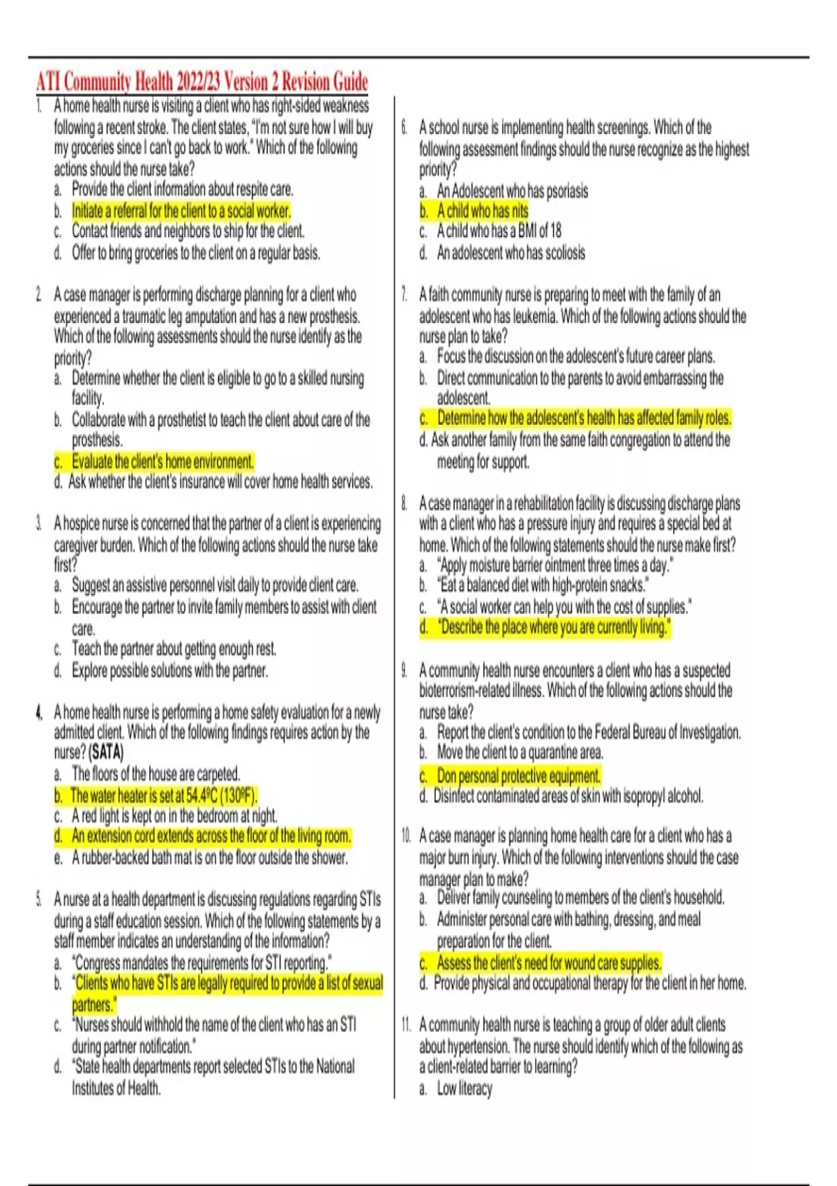 1. A home health nurse is visiting a client who has right-sided weakness following a recent stroke. The client states, “I’m not sure how I will buy my groceries since I can’t go back to work.” Which of the following actions should the nurse take? a. Provide the client information about respite care. b. Initiate a referral for the client to a social worker. c. Contact friends and neighbors to ship for the client. d. Offer to bring groceries to the client on a regular basis. 2. A case manager is performing discharge planning for a client who experienced a traumatic leg amputation and has a new prosthesis. Which of the following assessments should the nurse identify as the priority? a. Determine whether the client is eligible to go to a skilled nursing facility. b. Collaborate with a prosthetist to teach the client about care of the prosthesis. d. Ask whether the client’s insurance will cover home health services. 3. A hospice nurse is concerned that the partner of a client is experiencing caregiver burden. Which of the following actions should the nurse take first? a. Suggest an assistive personnel visit daily to provide client care. b. Encourage the partner to invite family members to assist with client care. c. Teach the partner about getting enough rest. d. Explore possible solutions with the partner. 4. A home health nurse is performing a home safety evaluation for a newly admitted client. Which of the following findings requires action by the nurse? (SATA) a. The floors of the house are carpeted. c. A red light is kept on in the bedroom at night. e. A rubber-backed bath mat is on the floor outside the shower. 5. A nurse at a health department is discussing regulations regarding STIs during a staff education session. Which of the following statements by a staff member indicates an understanding of the information? a. “Congress mandates the requirements for STI reporting.” b. “Clients who have STIs are legally required to provide a list of sexual partners.” c. “Nurses should withhold the name of the client who has an STI during partner notification.” d. “State health departments report selected STIs to the National Institutes of Health. 6. A school nurse is implementing health screenings. Which of the following assessment findings should the nurse recognize as the highest priority? a. An Adolescent who has psoriasis c. A child who has a BMI of 18 d. An adolescent who has scoliosis 7. A faith community nurse is preparing to meet with the family of an adolescent who has leukemia. Which of the following actions should the nurse plan to take? a. Focus the discussion on the adolescent’s future career plans. b. Direct communication to the parents to avoid embarrassing the adolescent. d. Ask another family from the same faith congregation to attend the meeting for support. 8. A case manager in a rehabilitation facility is discussing discharge plans with a client who has a pressure injury and requires a special bed at home. Which of the following statements should the nurse make first? a. “Apply moisture barrier ointment three times a day.” b. “Eat a balanced diet with high-protein snacks.” c. “A social worker can help you with the cost of supplies.” 9. A community health nurse encounters a client who has a suspected bioterrorism-related illness. Which of the following actions should the nurse take? a. Report the client’s condition to the Federal Bureau of Investigation. b. Move the client to a quarantine area. d. Disinfect contaminated areas of skin with isopropyl alcohol. 10. A case manager is planning home health care for a client who has a major burn injury. Which of the following interventions should the case manager plan to make? a. Deliver family counseling to members of the client’s household. b. Administer personal care with bathing, dressing, and meal preparation for the client. d. Provide physical and occupational therapy for the client in her home. 11. A community health nurse is teaching a group of older adult clients about hypertension. The nurse should identify which of the following as a client-related barrier to learning? a. Low literacy b. Fear of public speaking c. Limited experience d. Lack of credibility 12. A home health nurse is educating a client who has COPD and is to start using home oxygen via nasal cannula. Which of the following statements should the nurse identify as an indication that the client understands the teaching? a. “I should apply petroleum jelly to the nasal cannula prongs to prevent irritation.” b. “I should keep the oxygen delivery system at least 3 feet from a hearing vent.” c. “I should use wool blankets on my bed when I’m using the oxygen.” 13. A community health nurses planning an educational program for a group of women who are postmenopausal. Which of the following outcomes is appropriate for this program? a. Clients will significantly decrease caloric intake. b. Clients will arrange for mammograms every 3 years. d. Clients will start hormone replacement therapy. 14. A home health nurse is preparing to teach the family of a client who has a new diagnosis of HIV about infection control. Which of the following factors should the nurse identify as an educator-related barrier to learning? a. Reliance on written notes during the teaching session b. Previous experience teaching HIV management courses c. Use of educational materials in written and video format d. Use of humor to deal with disruptive behavior 15. A home health nurse is caring for a client who has methicillin-resistant Staphylococcus aureus. Which of the following actions should the nurse take? a. Encourage the client to use a HEPA filter in the house. b. Wear a mask when within 3 feet of the client. d. Remove fresh flowers from the client’s home. ...........................................................................................CONTINUE