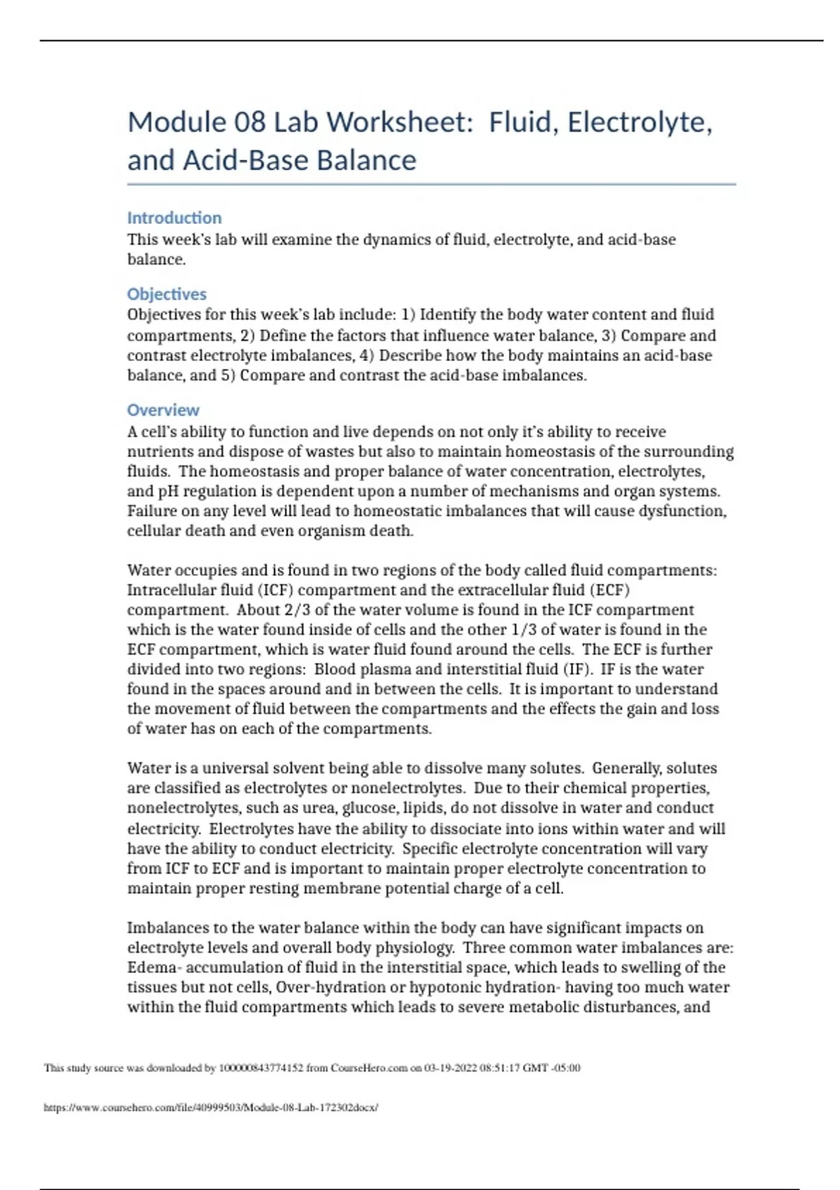 MA278 Rasmussen Mod 8 Fluid Electrolyte and Acid-Base Balance Lab Report