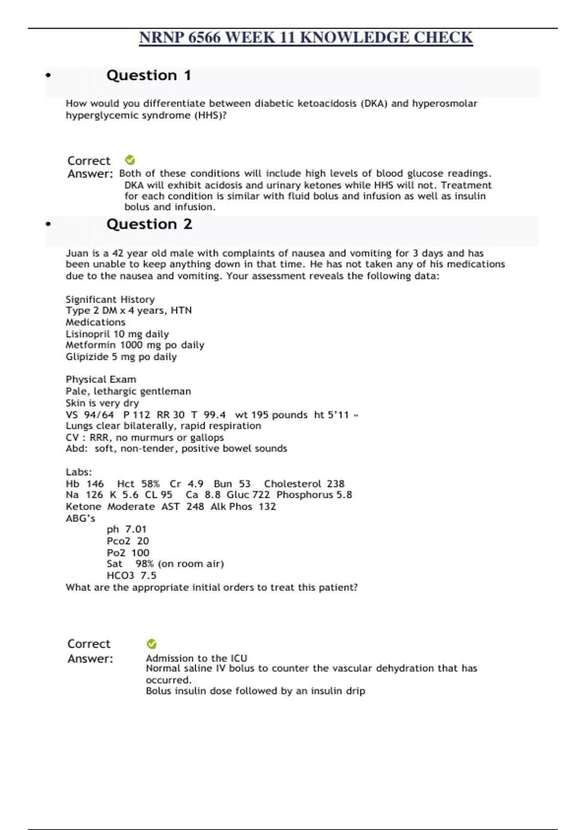 How would you differentiate between diabetic ketoacidosis (DKA) and hyperosmolar hyperglycemic syndrome (HHS)? Correct Answer: Both of these conditions will include high levels of blood glucose readings. DKA will exhibit acidosis and urinary ketones while HHS will not. Treatment for each condition is similar with fluid bolus and infusion as well as insulin bolus and infusion. Juan is a 42 year old male with complaints of nausea and vomiting for 3 days and has been unable to keep anything down in that time. He has not taken any of his medications due to the nausea and vomiting. Your assessment reveals the following data: Significant History Type 2 DM x 4 years, HTN Medications Lisinopril 10 mg daily Metformin 1000 mg po daily Glipizide 5 mg po daily Physical Exam Pale, lethargic gentleman Skin is very dry VS 94/64 P 112 RR 30 T 99.4 wt 195 pounds ht 5’11 » Lungs clear bilaterally, rapid respiration CV : RRR, no murmurs or gallops Abd: soft, non-tender, positive bowel sounds Labs: Hb 146 Hct 58% Cr 4.9 Bun 53 Cholesterol 238 Na 126 K 5.6 CL 95 Ca 8.8 Gluc 722 Phosphorus 5.8 Ketone Moderate AST 248 Alk Phos 132 ABG’s ph 7.01 Pco2 20 Po2 100 Sat 98% (on room air) HCO3 7.5 What are the appropriate initial orders to treat this patient? Correct Answer: Admission to the ICU Normal saline IV bolus to counter the vascular dehydration that has occurred. Bolus insulin dose followed by an insulin drip Electrolyte and blood glucose monitoring frequently fluid resuscitation and insulin administration. Bicarbonate is typically not administered unless the pH is below 7 Assess the patient for presence of any infection that may have precipitated this event Juan is a 42 year old male with complaints of nausea and vomiting for 3 days and has been unable to keep anything down in that time. He has not taken any of his medications due to the nausea and vomiting. Your assessment reveals the following data: Significant History Type 2 DM x 4 years, HTN Medications Lisinopril 10 mg daily Metformin 1000 mg po daily Glipizide 5 mg po daily Physical Exam Pale, lethargic gentleman Skin is very dry VS 94/64 P 112 RR 30 T 99.4 wt 195 pounds ht 5’11 » Lungs clear bilaterally, rapid respiration CV : RRR, no murmurs or gallops Abd: soft, non-tender, positive bowel sounds Labs: Hb 146 Hct 58% Cr 4.9 Bun 53 Cholesterol 238 Na 126 K 5.6 CL 95 Ca 8.8 Gluc 722 Phosphorus 5.8 Ketone Moderate AST 248 Alk Phos 132 ABG’s ph 7.01 Pco2 20 Po2 100 Sat 98% (on room air) HCO3 7.5 What is the “ corrected” sodium level for the hyperglycemia? What does this mean and how would it impact your treatment plan for this patient? Correct Answer: The equation for corrected sodium is: Corrected sodium (mEq/L) = measure sodium (mEq/L) + 0.016 {glucose (mg/dL)-100}. Juans corrected sodium is 136. 126+ 0.016 {722-100} = 135.95 The measured serum sodium concentration should be corrected for the hyperglycemia by adding 1.6 mEq per L to the measured sodium value. Corrected serum sodium concentrations of greater than 140 mE1 per L and calculated total osmolalities greater than 330 most per kg of water are associated with large fluid deficits. If the corrected sodium is less than 135 mEq/L, then isotonic saline should be continued at a rate of 250 to 500 mL/ hour. If the corrected sodium is normal or elevate, then IV fluid is generally switched to 0.45 normal saline. A 56 year old male with an acute COPD exacerbation is admitted to the ICU. He has type I diabetes and utilizes NPR and regular insulin twice a day to manage his diabetes. He is currently taking very little orally due to his shortness of breath. What would the best way to manage his diabetes and insulin needs in the ICU? Correct Answer: According to the American Diabetes Association (2019) guideline, basal long acting insulin should be administered once a day. Point of care blood glucose testing should be completed at least four times a day with sliding scale insulin coverage. The stress of illness will require the need for insulin but the evolution of the patients condition, varying oral intake, and medications will cause variations in the patients blood glucose. Point of care testing with sliding scale coverage along with basal insulin is the most flexible method to meet the patients insulin needs while in the ICU. A 56 year old male with an acute COPD exacerbation is admitted to the ICU. He has type I diabetes and utilizes NPR and regular insulin twice a day to manage his diabetes. He is currently taking very little orally due to his shortness of breath. What is the blood glucose goal for this patient in the ICU? Correct Answer: According to the American Diabetes Association (2019) guideline, pre-prandial blood glucose control of less than 126 is the goal. Post prandial no greater than 180. Hyperglycemia is associated with poor outcomes especially in critical illness. According to the NICE-SUGAR study, patients with goals lower than this (considered intensive insulin therapy) had increased mortality. Juan is a 42 year old male with complaints of nausea and vomiting for 3 days and has been unable to keep anything down in that time. He has not taken any of his medications due to the nausea and vomiting. Your assessment reveals the following data: Significant History Type 2 DM x 4 years, HTN Medications Lisinopril 10 mg daily Metformin 1000 mg po daily Glipizide 5 mg po daily Physical Exam Pale, lethargic gentleman Skin is very dry VS 94/64 P 112 RR 30 T 99.4 wt 195 pounds ht 5’11 » Lungs clear bilaterally, rapid respiration CV : RRR, no murmurs or gallops Abd: soft, non-tender, positive bowel sounds Labs: Hb 146 Hct 58% Cr 4.9 Bun 53 Cholesterol 238 Na 126 K 5.6 CL 95 Ca 8.8 Gluc 722 Phosphorus 5.8 Ketone Moderate AST 248 Alk Phos 132 ABG’s ph 7.01 Pco2 20 Po2 100 Sat 98% (on room air) HCO3 7.5 What patient education would be important to provided related to sick day management of his diabetes (include management of insulin) ? Correct Answer: Monitor your blood sugar frequent