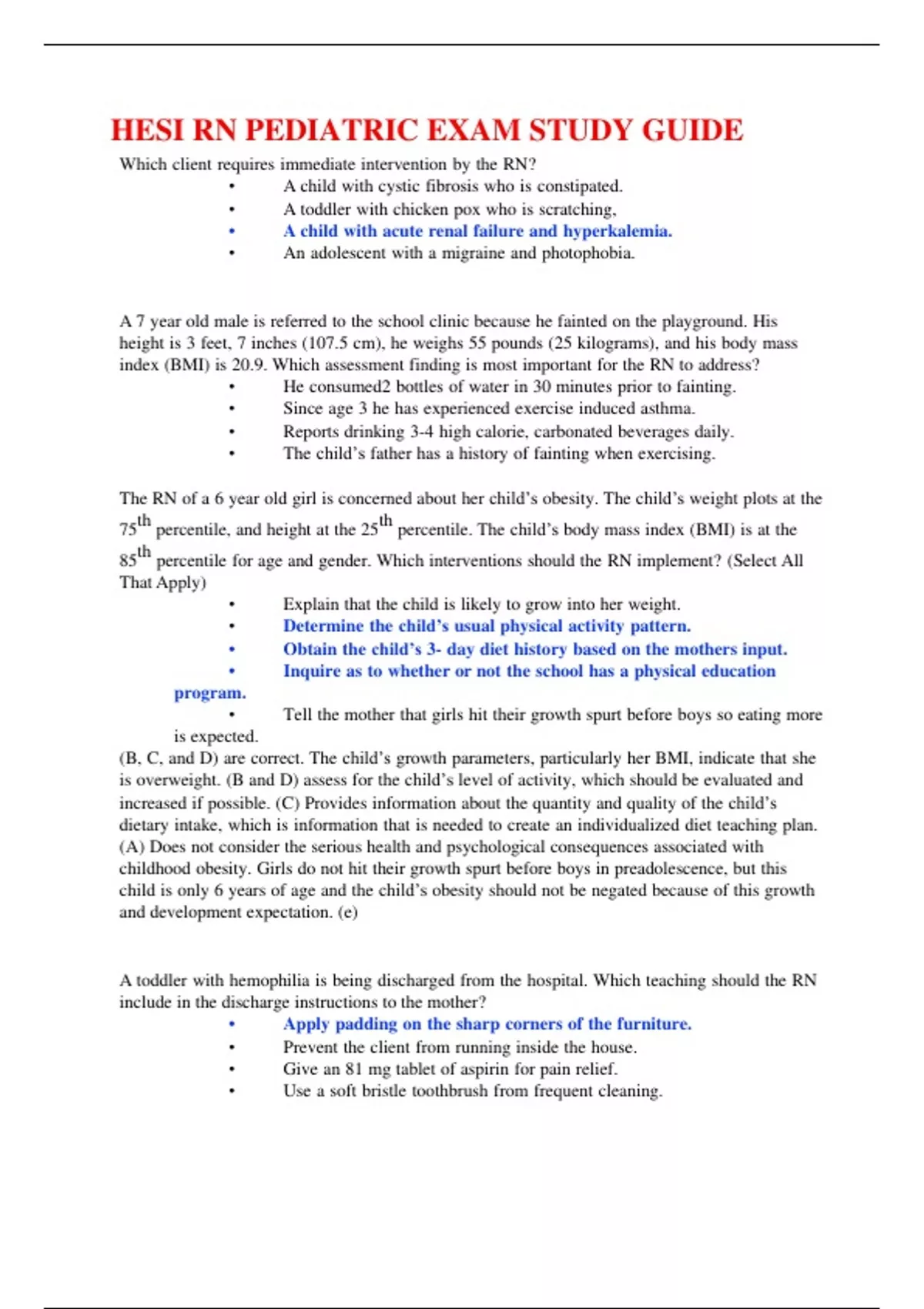 Which client requires immediate intervention by the RN? • A child with cystic fibrosis who is constipated. • A toddler with chicken pox who is scratching, • A child with acute renal failure and hyperkalemia. • An adolescent with a migraine and photophobia. A 7 year old male is referred to the school clinic because he fainted on the playground. His height is 3 feet, 7 inches (107.5 cm), he weighs 55 pounds (25 kilograms), and his body mass index (BMI) is 20.9. Which assessment finding is most important for the RN to address? • He consumed2 bottles of water in 30 minutes prior to fainting. • Since age 3 he has experienced exercise induced asthma. • Reports drinking 3-4 high calorie, carbonated beverages daily. • The child’s father has a history of fainting when exercising. The RN of a 6 year old girl is concerned about her child’s obesity. The child’s weight plots at the 75th percentile, and height at the 25th percentile. The child’s body mass index (BMI) is at the 85th percentile for age and gender. Which interventions should the RN implement? (Select All That Apply) • Explain that the child is likely to grow into her weight. • Determine the child’s usual physical activity pattern. • Obtain the child’s 3- day diet history based on the mothers input. • Inquire as to whether or not the school has a physical education program. • Tell the mother that girls hit their growth spurt before boys so eating more is expected. (B, C, and D) are correct. The child’s growth parameters, particularly her BMI, indicate that she is overweight. (B and D) assess for the child’s level of activity, which should be evaluated and increased if possible. (C) Provides information about the quantity and quality of the child’s dietary intake, which is information that is needed to create an individualized diet teaching plan. (A) Does not consider the serious health and psychological consequences associated with childhood obesity. Girls do not hit their growth spurt before boys in preadolescence, but this child is only 6 years of age and the child’s obesity should not be negated because of this growth and development expectation. (e) A toddler with hemophilia is being discharged from the hospital. Which teaching should the RN include in the discharge instructions to the mother? • Apply padding on the sharp corners of the furniture. • Prevent the client from running inside the house. • Give an 81 mg tablet of aspirin for pain relief. • Use a soft bristle toothbrush from frequent cleaning. The RN is examining an infant for possible cryptorchidism. Which examine technique should be used? • Place the infant in a side lying position to facilitate the exam. • Hold the penis and extract the foreskin gently. • Cleanse the penis with an antiseptic-soaked pad. • Place the infant in a warm room and use a calm approach. An infant who has been diagnosed with a tracheoesophageal fistula (TEF). What nursing intervention is indicated for this infant prior to surgical repair? • Provide frequent sips of liquid. • Give isotonic enemas as prescribed. • Maintain nothing by mouth status. • Prepare the infant for a barium enema. An adolescent with non- Hodgkin’s lymphoma (NHL) is complaining of a sore mouth two days after beginning chemotherapy. What activity should the RN implement? • Encourage large meals during steroid and chemotherapy. • Provide lemon glycerin swabs and dilute peroxide oral rinses. • Recommend fluids using citrus juices and drinking with a straw. • Frequent use of saline oral rinses and a soft sponge toothbrush. A child with acute laryngotracheobronchitis (croup) received epinephrine 2 hours ago in the emergency room, and now is being prepared for discharge to go home. The RN should instruct the parents to take which action if the child’s uncontrolled coughing reoccurs? • Call for emergency transportation to the hospital. • Increase the fluid intake to liquefy the secretions. • Administer a dose of the prescribed cough medicine. • Sit with the child in the bathroom with hot steam. Moist, warm air (D) promotes bronchodilation, which helps relieve spasms that cause the coughing. If the symptoms continue or worsen, the child may need to be transported to the hospital (A). Fluids will thin the secretions (B) and cough medicine (C) may decrease cough, but neither of these interventions decrease swelling or dilate the airway to improve breathing. The RN is performing a routine examination of a 6-month old infant at the community health clinic. Records indicate that the child weighed 3 kg at birth. The clinic uses lbs to describe weight. When assessing this child, approximately what weight, in lbs, should the RN consider to be within normal range for this child? • 15 to 18 lbs. • 12 to 15 lbs. • 9 to 11.5 lbs. • 6 to 7.5 lbs. Birth weight should at least be double at this time. When developing a teaching plan for an adolescent male who was recently diagnosed with Type 1 Diabetes Mellitus, the RN should instruct the client to eat a source of sugar if which symptom occurs? • Excessive thirst. • Racing pulse. • Profuse perspiration. • Seeing spots. Tachycardia is one of the symptoms of hypoglycemia. A breast feeding mother returns to work when her infant is 5 months old. She is having difficulty pumping enough milk to mete her infant’s dietary requirements. Which suggestion should the RN provide to this mother? • Mix infants formula with breast milk. • Supplement with an iron-rich formula. • Introduce baby food for one meal daily. • Offer a follow-up transitional formula. The RN is evaluating the effects of thyroid therapy used to treat a 5 month old with hypothyroidism. Which behavior indicates that the treatment has been effective? • Keeps fists clenched, opens hands when grasping an object. • Has strong Moro and tonic neck reflexes. • Can lift head, but not chest when lying on abdomen. • Laughs readily, tu