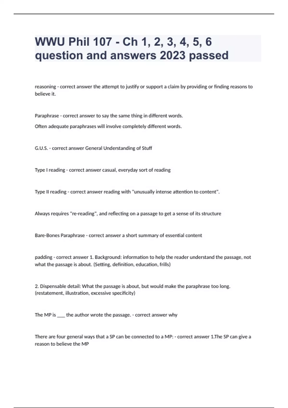 WWU Phil 107 - Ch 1, 2, 3, 4, 5, 6 question and answers 2023 passed reasoning - correct answer the attempt to justify or support a claim by providing or finding reasons to believe it. Paraphrase - correct answer to say the same thing in different words. Often adequate paraphrases will involve completely different words. G.U.S. - correct answer General Understanding of Stuff Type I reading - correct answer casual, everyday sort of reading Type II reading - correct answer reading with "unusually intense attention to content". Always requires "re-reading", and reflecting on a passage to get a sense of its structure Bare-Bones Paraphrase - correct answer a short summary of essential content padding - correct answer 1. Background: information to help the reader understand the passage, not what the passage is about. (Setting, definition, education, frills) 2. Dispensable detail: What the passage is about, but would make the paraphrase too long. (restatement, illustration, excessive specificity) The MP is ___ the author wrote the passage. - correct answer why There are four general ways that a SP can be connected to a MP: - correct answer 1.The SP can give a reason to believe the MP 2.The SP can explain why the MP happened 3.The SP can be a result or consequence of the MP 4.The SP can give more detail about the MP [s], support - correct answer (giving a reason or argument) [e], explanation - correct answer (explaining why the MP happened) [r], result - correct answer (describing a result or upshot of the MP) [q], qualification - correct answer (giving detail about the MP) [e], etiology - correct answer (explanation of how the MP came about) explanation vs etiology - correct answer As opposed to 'explanation of how the object in the MP works', 'explanation of who was involved in the event the MP describes', and so on. These details about the MP would be coded with [q]. 'etiology' is narrower than 'explanation'. Think: "why did the MP occur?", "what brought the MP about?" [ec] - correct answer CAUSE SP causes MP. "Neal stepped on your foot because he was pushed." [em] - correct answer MOTIVE SP is the person's motive for doing the action in the MP.