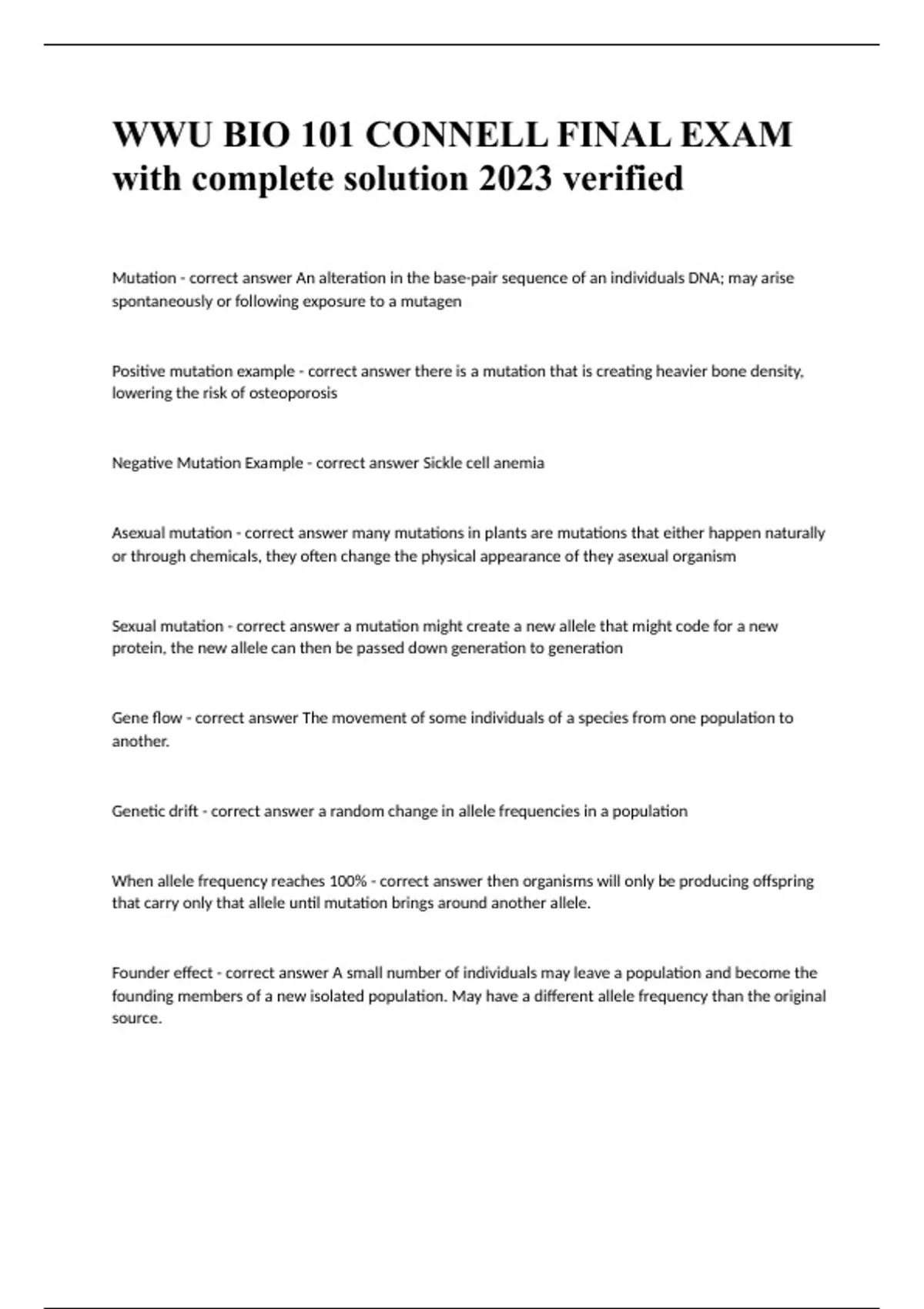 WWU BIO 101 CONNELL FINAL EXAM with complete solution 2023 verified Mutation - correct answer An alteration in the base-pair sequence of an individuals DNA; may arise spontaneously or following exposure to a mutagen Positive mutation example - correct answer there is a mutation that is creating heavier bone density, lowering the risk of osteoporosis Negative Mutation Example - correct answer Sickle cell anemia Asexual mutation - correct answer many mutations in plants are mutations that either happen naturally or through chemicals, they often change the physical appearance of they asexual organism Sexual mutation - correct answer a mutation might create a new allele that might code for a new protein, the new allele can then be passed down generation to generation Gene flow - correct answer The movement of some individuals of a species from one population to another. Genetic drift - correct answer a random change in allele frequencies in a population When allele frequency reaches 100% - correct answer then organisms will only be producing offspring that carry only that allele until mutation brings around another allele. Founder effect - correct answer A small number of individuals may leave a population and become the founding members of a new isolated population. May have a different allele frequency than the original source.