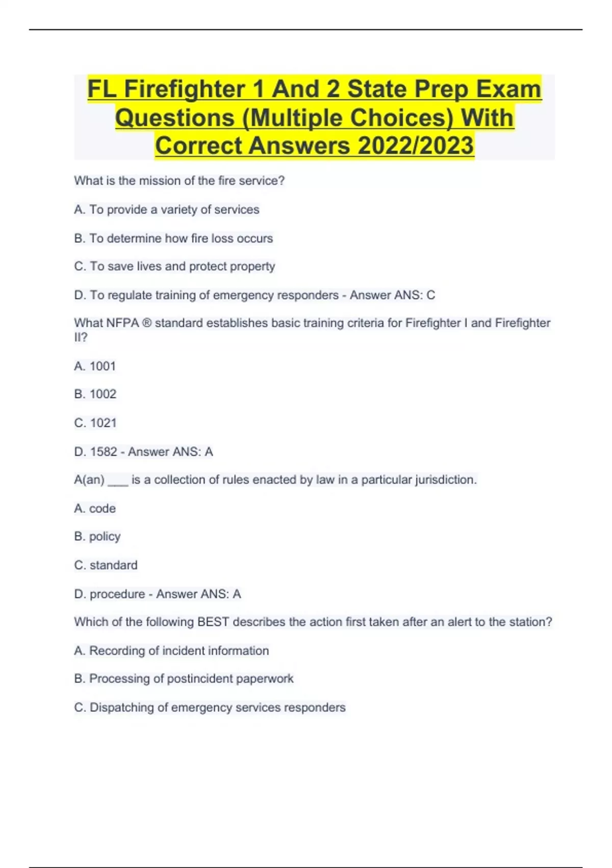 FL Firefighter 1 And 2 State Prep Exam Questions (Multiple Choices) With Correct Answers 2022/2023