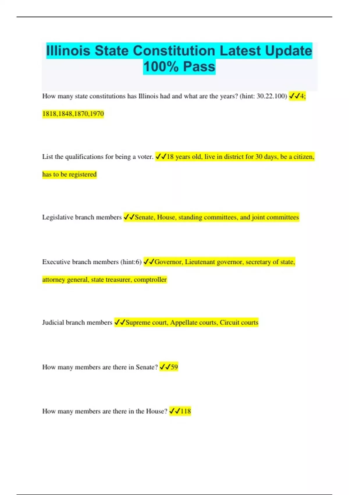 Illinois State Constitution Latest Update 100% Pass How many state constitutions has Illinois had and what are the years? (hint: 30.22.100) 4; 1818,1848,1870,1970 List the qualifications for being a voter. 18 years old, live in district for 30 days, be a citizen, has to be registered Legislative branch members Senate, House, standing committees, and joint committees Executive branch members (hint:6) Governor, Lieutenant governor, secretary of state, attorney general, state treasurer, comptroller Judicial branch members Supreme court, Appellate courts, Circuit courts How many members are there in Senate? 59 How many members are there in the House? 118 Term for Senate? 4 years Term for House? 2 years Qualifications for legislative branch? Each member of the general assembly, 21 years old, resident of district for 2 years, be a citizen Executive branch term? 4 years for all Qualifications for executive branch? Be a citizen, 25 years old, resident of sate for 3 years What is the circuit court divided into? (hint: 5) Felony, misdemeanors, small claims, family, juvenile, and other small courts How many terms does the circuit court serve? 6 year terms Associate judges term? 4 year terms How many justices hear each appellate case? 3 What is the term for appellate judges? 10 years How many members in supreme court? 7 Chief justice term? 3 years Judges in supreme court term? 10 years Qualifications for judges in judicial branch? Be citizens, licensed attorneys of the state, and residents of the district from which they were elected. Which is not state court? District Court The judges with the shortest term are: Circuit The state is divided into how many judicial districts? 5 How are judges usually selected? By law Where do most of the state's court cases take place? Circuit What are the 3 types of courts in Illinois? Supreme, circuit, appellate How many aldermen/women are there? 50 How any wards are there? 50 What is the term for the mayor? 4 years Who is in charge of the city council? The Mayor What form of government does Chicago have? Municipal Government (mayor and council form) What is the name of the city's legislative body? City council What is the population of Chicago? 2.9 million Who is currently the mayor of Chicago? Rahm Emanuel Who is the senate and House elected by? The people (us) What is another name for the legislative branch in the state? General Assembly Which house starts impeachment proceedings? The House Which house approves appointments of the governor? Senate Which house tries impeachment cases? Senate Which house meets in Springfield? Both Which house has one from each district? Both what are lobbies? They are organized groups that seek to influence lawmakers Give examples of a lobbying group. Death penalty, animals, etc How do bills become a law? With a majority vote How any subjects can one bill cover? 1 when my he houses adjourn? (be dismissed) When each house has the approval to do so How many days can the governor consider a bill? 60 days On how many days can the bill be read? On 3 different days by title before final vote What is the order of succession to the office of governor? Lieutenant governor, attorney general, secretary of state What is the governor's job? Enforces the law Who is the commander in chief of the state militia? The governor Can the governor veto a bill? Yes what is the governor in charge of? Foreign affairs, and he can grant pardons, delay the punishment(reprieves), and change the punishment to a less severe one(commutations) Who keeps the Great Seal? Secretary of state Who maintains the records of the General Assembly? Secretary of state Who is the chief legal officer? Attorney general Who maintains central fisical accounts? Comptroller Who follows orders assigned by the governor? Lieutenant governor Who keeps safe the money and securities? Treasurer Who is the current governor? Patt Quin
