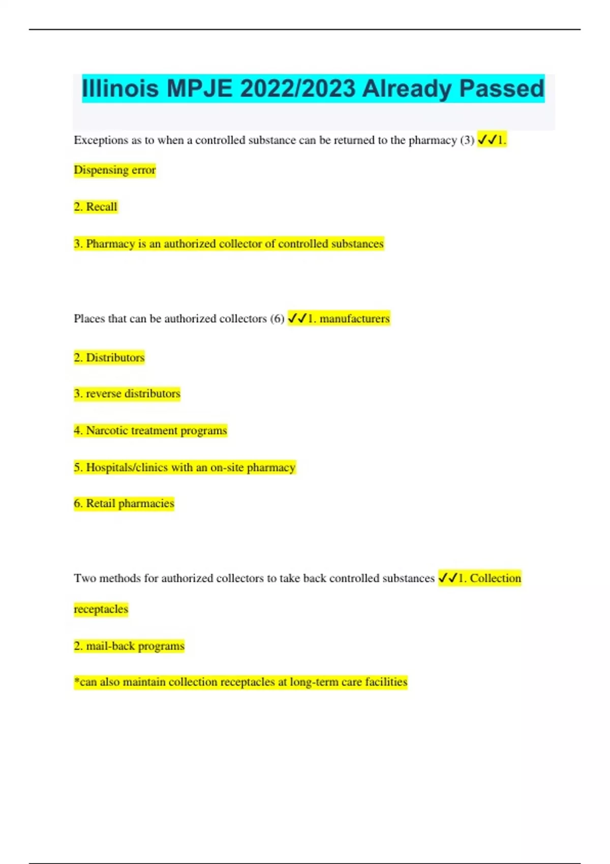 Illinois MPJE 2022/2023 Already Passed Exceptions as to when a controlled substance can be returned to the pharmacy (3) 1. Dispensing error 2. Recall 3. Pharmacy is an authorized collector of controlled substances Places that can be authorized collectors (6) 1. manufacturers 2. Distributors 3. reverse distributors 4. Narcotic treatment programs 5. Hospitals/clinics with an on-site pharmacy 6. Retail pharmacies Two methods for authorized collectors to take back controlled substances 1. Collection receptacles 2. mail-back programs *can also maintain collection receptacles at long-term care facilities What is the method of destruction for controlled substances? No specific instructions, but must be "non-retrievable" (permanently altering the controlled substance's physical or chemical condition by irreversible means) Two ways patients can dispose of controlled substances 1. Law enforcement 2. DEA take back programs What are 5 categories of entities that must register with the DEA when it comes to controlled substance distribution, manufacturing, etc? 1. Manufacturers 2. Distributor 3. Dispenser 4. Narcotic treatment programs 5. Detox compounder What kind of DEA registration is needed for physicians or NPs/PAs in order to prescribe CS? dispenser registration What is a narcotic? produced directly or indirectly by extraction from substances of vegetable origin or via chemical synthesis or by a combination When an entity applies for DEA registration, the registration form is signed by the "owner", who is: 1. The "sole proprietor" if the entity is a sole proprietorship 2. Partnership: any partner is the owner, and can complete the form 3. Corporation: any officer or director of the corporation can complete the form What is a POA? Power of attorney: allows someone other than the registrant to issue orders for C1 or C2 substances via DEA Form 222 The POA form for DEA form 222: who must execute and sign? Executed by the person who signed the most recent application for DEA registration or reregistration, the person to whom the POA is being granted and two witnesses Who can revoke a POA? the person who signed the most recent application for DEA registration and two witnesses Who can be a POA? Who is preferred to be a POA? Can be anyone: non-pharmacist owners, techs, interns, and unlicensed persons. BUT it is always preferable (even if not legally required) that only pharmacists order controlled substances Pharmacies register as a __ of controlled substances. One registration covers dispensing of all C2-C5 substances. dispenser Pharmacies and other dispensers register with DEA Form ___ for initial registration, and DEA Form __ for renewal. Renewal is every __ years. 224; 224a; 3 Neither federal or IL law require the applicant or the person with POA to be a pharmacist. However, under state law, the ordering, securing and dispensing of CS is the responsibility of the __, regardless whether they are the registrant, or has POA