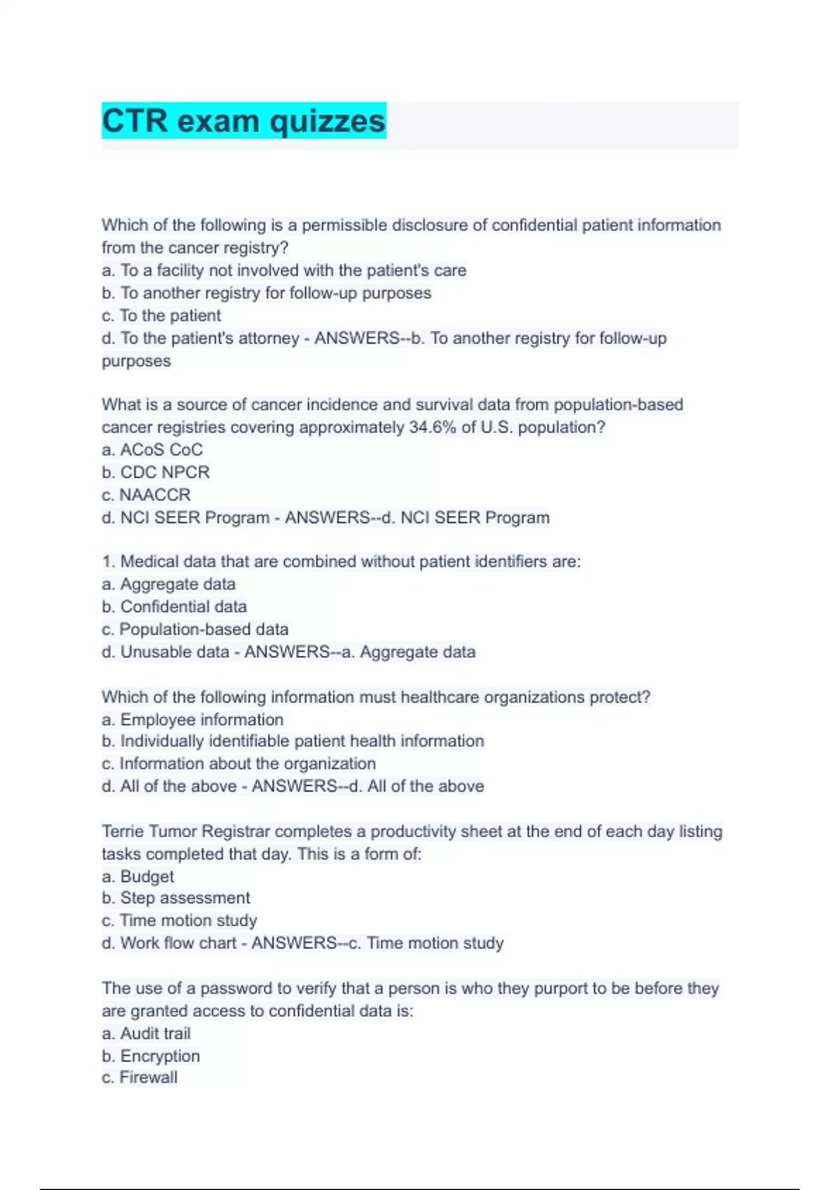 CTR exam quizzes 2023 LATEST Which of the following is a permissible disclosure of confidential patient information from the cancer registry? a. To a facility not involved with the patient's care b. To another registry for follow-up purposes c. To the patient d. To the patient's attorney - ANSWERS--b. To another registry for follow-up purposes