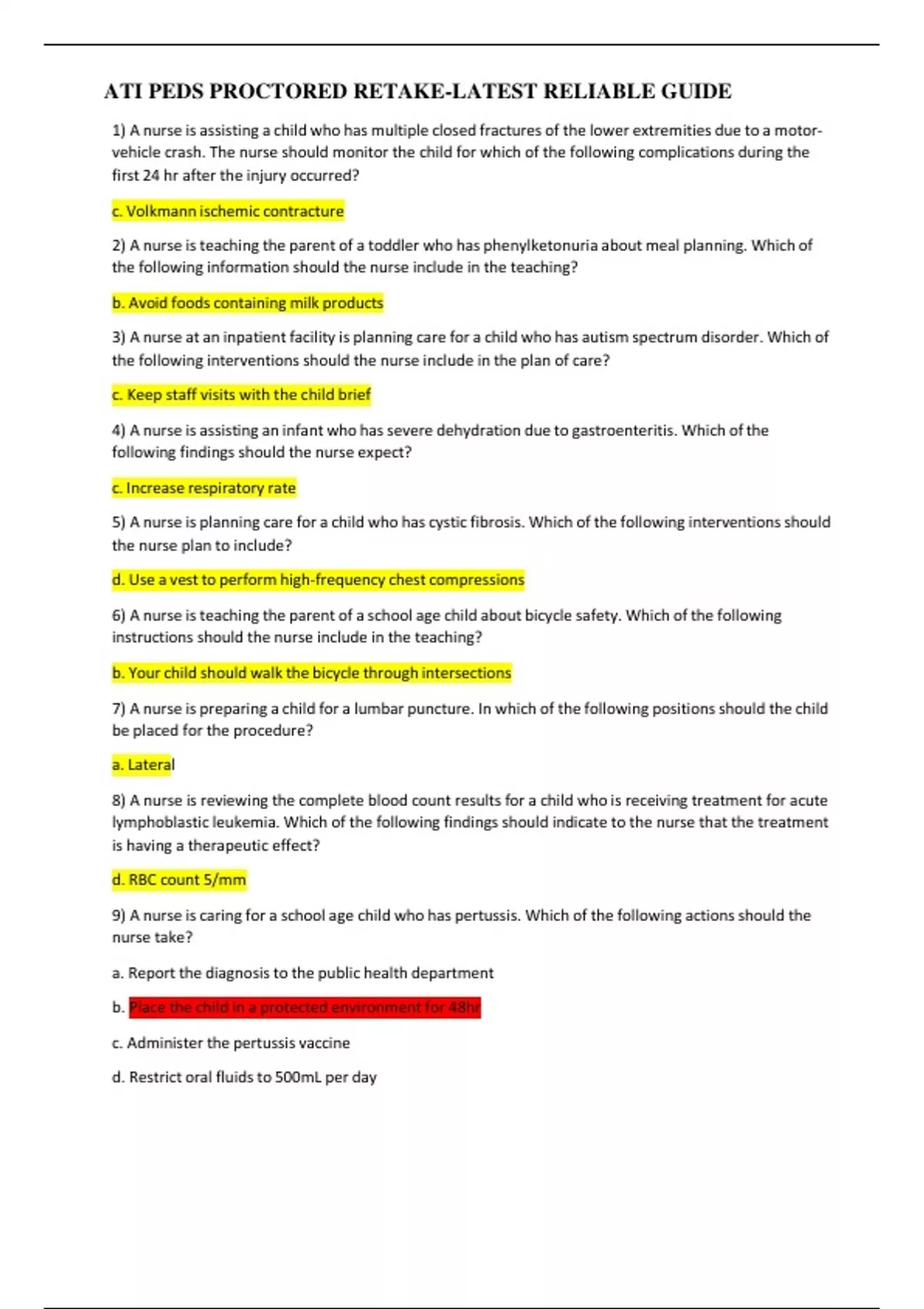 1) A nurse is assisting a child who has multiple closed fractures of the lower extremities due to a motor- vehicle crash. The nurse should monitor the child for which of the following complications during the first 24 hr after the injury occurred? c. Volkmann ischemic contracture 2) A nurse is teaching the parent of a toddler who has phenylketonuria about meal planning. Which of the following information should the nurse include in the teaching? b. Avoid foods containing milk products 3) A nurse at an inpatient facility is planning care for a child who has autism spectrum disorder. Which of the following interventions should the nurse include in the plan of care? c. Keep staff visits with the child brief 4) A nurse is assisting an infant who has severe dehydration due to gastroenteritis. Which of the following findings should the nurse expect? c. Increase respiratory rate 5) A nurse is planning care for a child who has cystic fibrosis. Which of the following interventions should the nurse plan to include? d. Use a vest to perform high-frequency chest compressions 6) A nurse is teaching the parent of a school age child about bicycle safety. Which of the following instructions should the nurse include in the teaching? b. Your child should walk the bicycle through intersections 7) A nurse is preparing a child for a lumbar puncture. In which of the following positions should the child be placed for the procedure? a. Lateral 8) A nurse is reviewing the complete blood count results for a child who is receiving treatment for acute lymphoblastic leukemia. Which of the following findings should indicate to the nurse that the treatment is having a therapeutic effect? d. RBC count 5/mm 9) A nurse is caring for a school age child who has pertussis. Which of the following actions should the nurse take? a. Report the diagnosis to the public health department b. Place the child in a protected environment for 48hr c. Administer the pertussis vaccine d. Restrict oral fluids to 500mL per day 10) A nurse is assessing a week old infant. The nurse should identify which of the following manifestations can indicate neonatal abstinence syndrome? d. Lethargy 11 )A nurse is preparing to initiate IV antibiotic therapy for a newly admitted 12 month-old infant. Which of the following actions should the nurse plan to take? c. Cover the insertion site with an opaque dressing 12) A nurse is assessing a toddler who is 8 hr. postoperative following a cardiac catheterization procedure. Which of the following findings should the nurse report to the provider? c. Bilateral cool extremities ................................................................................................CONTINUE