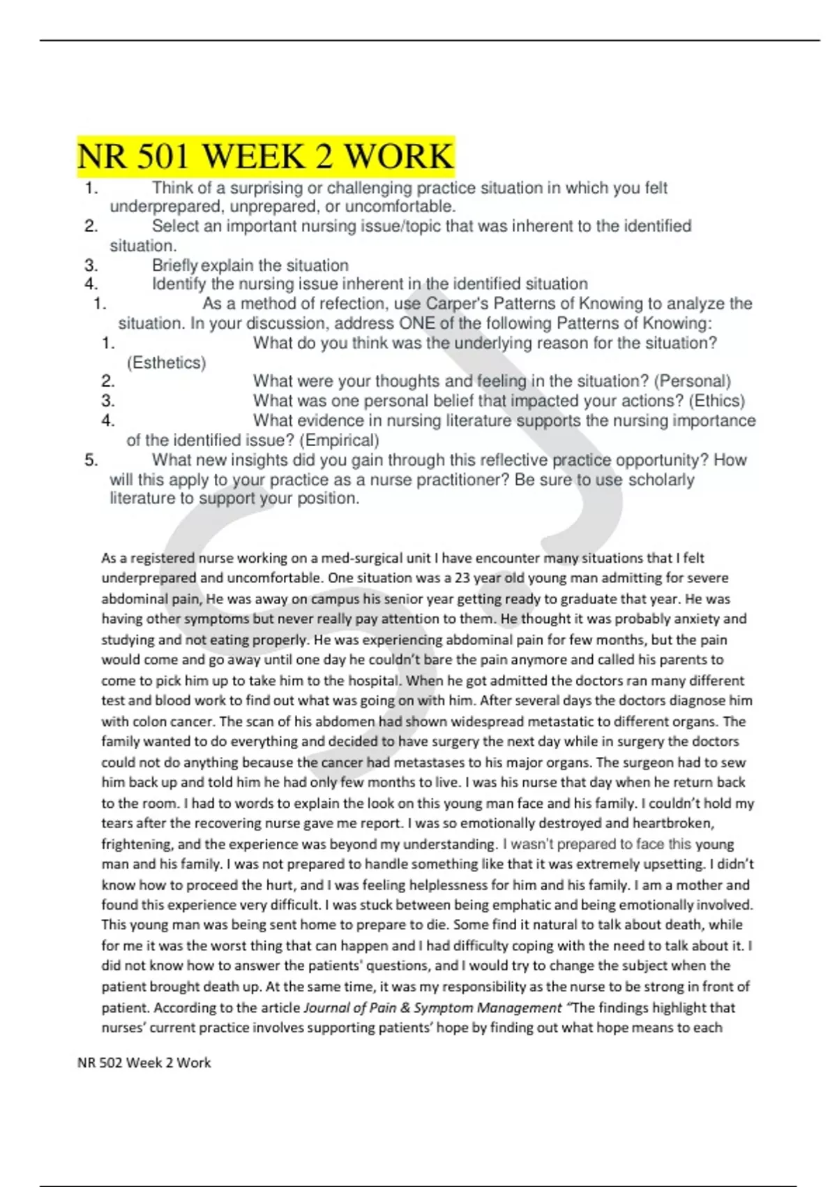 NR 501 WEEK 2 WORK / NR 501 WEEK 2 WORK 1. Think of a surprising or challenging practice situation in which you felt underprepared, unprepared, or uncomfortable. 2. Select an important nursing issue/topic that was inherent to the identified situation....