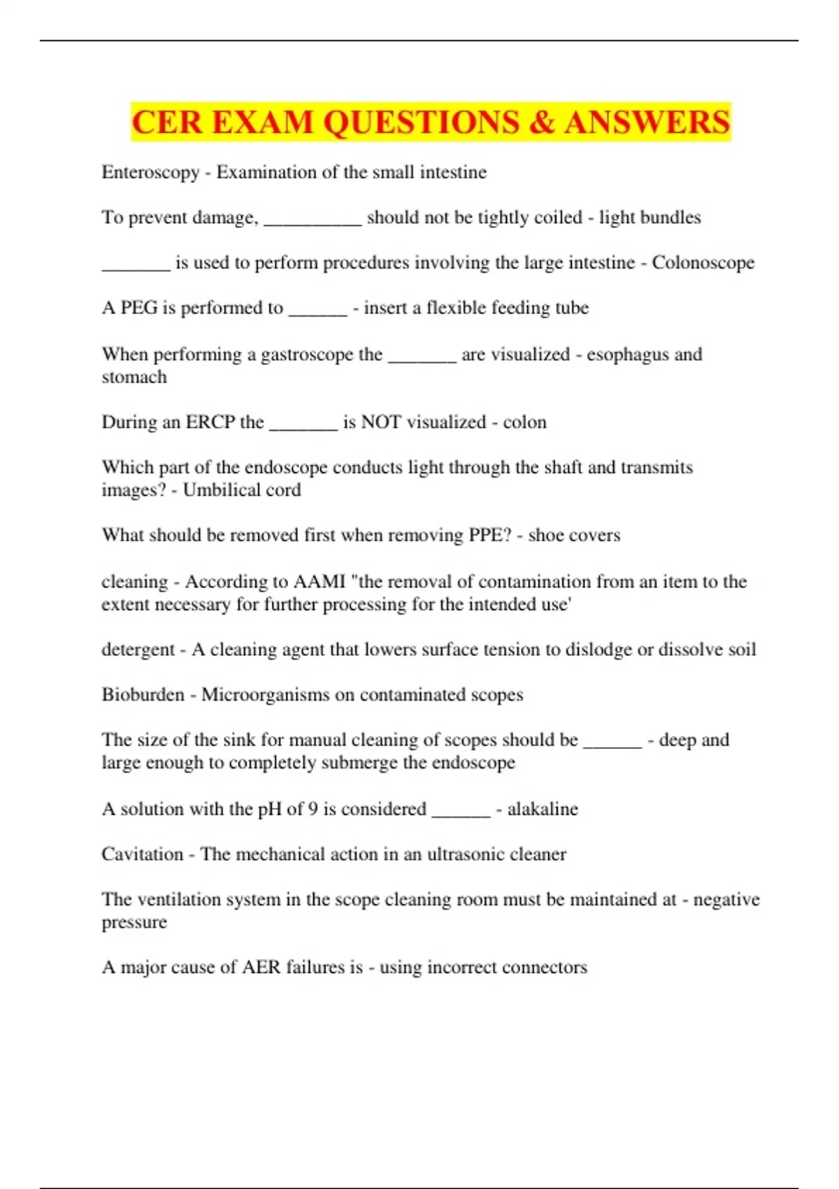CER EXAM 2023/2024: QUESTIONS & ANSWERS-Enteroscopy - Examination of the small intestine To prevent damage, __________ should not be tightly coiled - light bundles _______ is used to perform procedures involving the large intestine - Colonoscope A PEG is performed to ______ - insert a flexible feeding tube When performing a gastroscope the _______ are visualized - esophagus and stomach During an ERCP the _______ is NOT visualized - colon Which part of the endoscope conducts light through the shaft and transmits images? - Umbilical cord What should be removed first when removing PPE? - shoe covers cleaning - According to AAMI "the removal of contamination from an item to the extent necessary for further processing for the intended use' detergent - A cleaning agent that lowers surface tension to dislodge or dissolve soil Bioburden - Microorganisms on contaminated scopes The size of the sink for manual cleaning of scopes should be ______ - deep and large enough to completely submerge the endoscope A solution with the pH of 9 is considered ______ - alakaline Cavitation - The mechanical action in an ultrasonic cleaner The ventilation system in the scope cleaning room must be maintained at - negative pressure A major cause of AER failures is - using incorrect connectors OSHA - requires the eyewash stations be available or emergency use The OSHA Hazard Communication requires that MSDS must be available for _______ - each chemical in the department How often should cleaning and sterilization instructions be requested from the device manufacturer? - each time the item is purchased Semi-critical - According to Dr. Earl Spaulding, devices that come in contact with intact mucous membranes during use Electrical equipment - Class C fire extinguisher