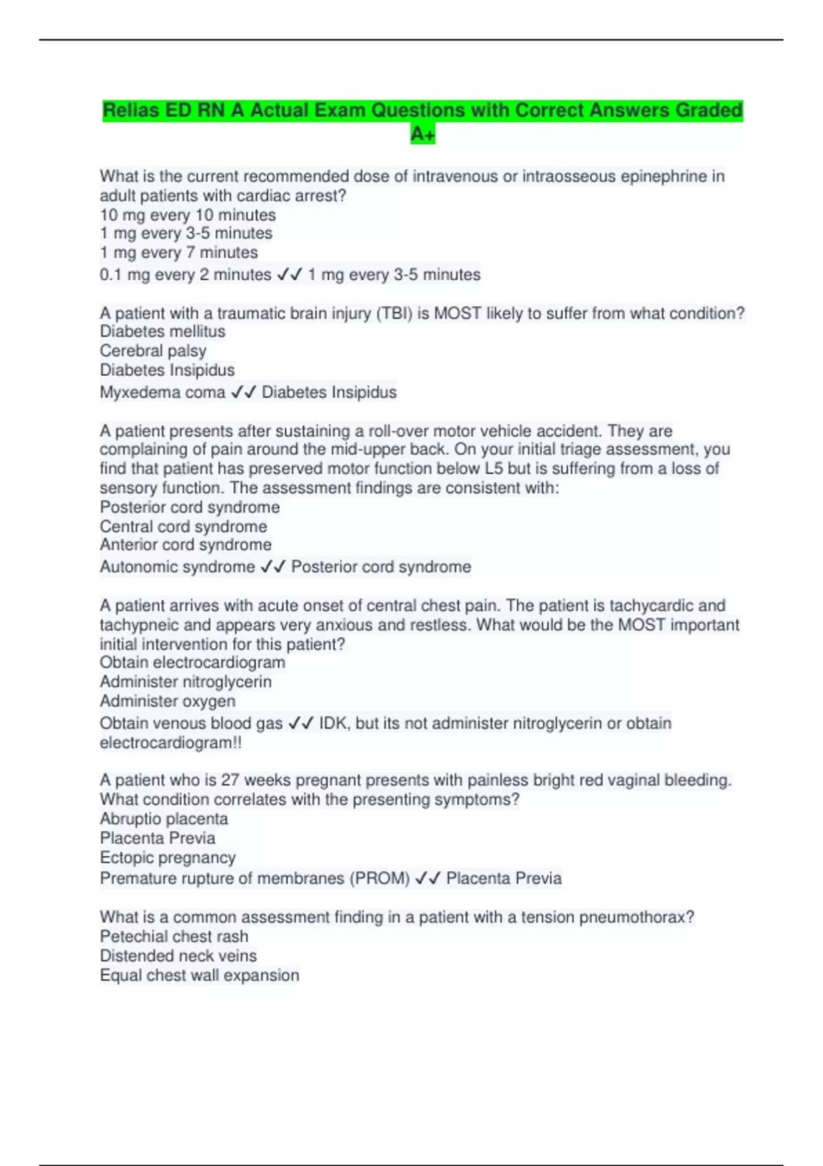 What is the current recommended dose of intravenous or intraosseous epinephrine in adult patients with cardiac arrest? 10 mg every 10 minutes 1 mg every 3-5 minutes 1 mg every 7 minutes 0.1 mg every 2 minutes 1 mg every 3-5 minutes A patient with a traumatic brain injury (TBI) is MOST likely to suffer from what condition? Diabetes mellitus Cerebral palsy Diabetes Insipidus Myxedema coma Diabetes Insipidus A patient presents after sustaining a roll-over motor vehicle accident. They are complaining of pain around the mid-upper back. On your initial triage assessment, you find that patient has preserved motor function below L5 but is suffering from a loss of sensory function. The assessment findings are consistent with: Posterior cord syndrome Central cord syndrome Anterior cord syndrome Autonomic syndrome Posterior cord syndrome A patient arrives with acute onset of central chest pain. The patient is tachycardic and tachypneic and appears very anxious and restless. What would be the MOST important initial intervention for this patient? Obtain electrocardiogram Administer nitroglycerin Administer oxygen Obtain venous blood gas IDK, but its not administer nitroglycerin or obtain electrocardiogram!! A patient who is 27 weeks pregnant presents with painless bright red vaginal bleeding. What condition correlates with the presenting symptoms? Abruptio placenta Placenta Previa Ectopic pregnancy Premature rupture of membranes (PROM) Placenta Previa What is a common assessment finding in a patient with a tension pneumothorax? Petechial chest rash Distended neck veins Equal chest wall expansionFlattened neck veins Distended Neck Veins A patient presents with a two-day history of fever, cough, mild shortness of breath (SOB), sore throat, myalgia, and new onset of loss of taste and smell. What is the patient MOST likely suffering from? Giardia Microsporidia COVID 19 Tuberculosis COVID 19 The deficiency of anti-diuretic hormone (ADH) can lead to what endocrine disorders? Diabetes Insipidus Diabetes Mellitus Adrenal Insufficiency Syndrome of inappropriate secretion of ADH (SIADH) Diabetes Insipidus A patient presents after an intentional overdose of propranolol approximately 2 hours ago. The patient has severe hypotension and bradycardia. IV fluids and vasopressors are initiated. What nursing assessment findings indicate the treatment has been effective? Decreasing pulse pressure Decreasing central venous pressure Increasing serum glucose Increasing serum cortisol Increasing serum glucose A patient presents with acute onset of chest pain and goes into cardiac arrest immediately upon arrival. What is a possible reversible cause of cardiac arrest? Hypervolemia Alkalosis Hyperthermia Tension Pneumothorax Tension Pneumothorax Which of the following represent categories utilized to triage patients during a mass casualty incident (MCI)? Green, orange, black, purple Green, blue, red, black Red, black, pink, yellow Green, yellow, red, black Green, yellow, red, black