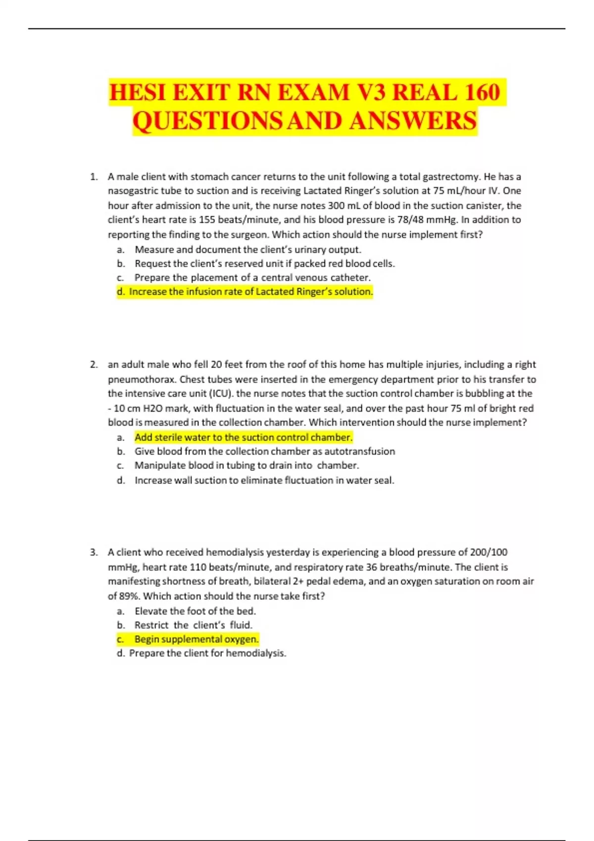 HESI EXIT RN EXAM V3 REAL 160 QUESTIONS AND ANSWERS HESI EXIT RN EXAM V3 REAL 160 QUESTIONS AND ANSWERS 1. A male client with stomach cancer returns to the unit following a total gastrectomy. He has a nasogastric tube to suction and is receiving Lactated Ringer’s solution at 75 mL/hour IV. One hour after admission to the unit, the nurse notes 300 mL of blood in the suction canister, the client’s heart rate is 155 beats/minute, and his blood pressure is 78/48 mmHg. In addition to reporting the finding to the surgeon. Which action should the nurse implement first? a. Measure and document the client’s urinary output. b. Request the client’s reserved unit if packed red blood cells. c. Prepare the placement of a central venous catheter. d. Increase the infusion rate of Lactated Ringer’s solution. 2. an adult male who fell 20 feet from the roof of this home has multiple injuries, including a right pneumothorax. Chest tubes were inserted in the emergency department prior to his transfer to the intensive care unit (ICU). the nurse notes that the suction control chamber is bubbling at the - 10 cm H2O mark, with fluctuation in the water seal, and over the past hour 75 ml of bright red blood is measured in the collection chamber. Which intervention should the nurse implement? a. Add sterile water to the suction control chamber. b. Give blood from the collection chamber as autotransfusion c. Manipulate blood in tubing to drain into chamber. d. Increase wall suction to eliminate fluctuation in water seal. 3. A client who received hemodialysis yesterday is experiencing a blood pressure of 200/100 mmHg, heart rate 110 beats/minute, and respiratory rate 36 breaths/minute. The client is manifesting shortness of breath, bilateral 2+ pedal edema, and an oxygen saturation on room air of 89%. Which action should the nurse take first? a. Elevate the foot of the bed. b. Restrict the client’s fluid. c. Begin supplemental oxygen. d. Prepare the client for hemodialysis. 4. A client with Addison’s crisis is admitted for treatment with adrenal cortical supplementation. Based on the client’s admitting diagnosis, which findings require immediate action by the nurse? (Select all that apply) a. Headache and tremors b. Irregular heart rate c. Skin hyperpigmentation d. Postural hypotension e. Pallor and diaphoresis 5. An older client is admitted with fluid volume deficit and dehydration. Which assessment finding is the best indicator of hydration that the nurse should report to the healthcare provider? a. Urine specific gravity is 1.040 b. Systolic blood pressure decreases 10 points when standing. c. The client denies being thirsty. d. Skin tenting occurs when the client’s forearm is pinched. 6. After an inservice about electronic health record (EHR) security and safeguarding client information, the nurse observes a colleague going home with printed copies of client information in a uniform pocket. Which action should the nurse take? a. File a detailed incident report with the specific hiring facility. b. Warn the colleague that their actions are unprofessional. c. Comment anonymously about the action of a staff discussion board. d. Communicate the colleague’s actions to the unit charge nurse. 7. The nurse is evaluating a tertiary prevention program for clients with cardiovascular disease implemented in a rural health clinic. Which outcome indicate the program is effective? a. At-risk clients received an increased number of routine health screenings. b. Clients reported having new confidence in making healthy food choices. c. Clients who incurred disease complications promptly received rehabilitation. d. Client relapse rate of 30% in a 5-year community-wide anti-smoking campaign. 8. The nurse is caring for a client with chronic obstructive pulmonary disease (COPD) who uses oxygen at 2 L/minute per nasal cannula continuously. The nurse observes that the client is having increased shortness of breath with respirations at 23 breaths/minute. Which action should the nurse implement first? a. Determine if the client is experiencing any anxiety. b. Auscultate the client’s bilateral lung sounds and oxygen saturation. c. Notify the healthcare provider about the client’s distress. d. Assess the delivery mechanism of the oxygen tank, tubing, and cannula. 9. Which statement by a client who is 24 hours post-subtotal thyroidectomy requires an immediate investigation by the nurse? a. “When I get out of bed quickly, I feel a little dizzy.” b. “The dressing over my incision feels like it is too tight.” c. “I’m most comfortable when the head of the bed is raised.” d. “This IV infusion makes me urinate more often than usual.” 10. An older adult male who is in his early 70’s is admitted to the emergency department because of a COPD exacerbation. This client is struggling to breathe and the healthcare team is preparing for endotracheal intubation. The spouse’s wife, who is 30 years younger than the client, asks the nurse to stop the procedure and provide the nurse a copy of the client’s living will. Which action should the nurse take? a. Facilitate a family meeting with the palliative care team. b. Notify the healthcare provider of the client’s wishes. c. Place a certified copy of the living will in the client’s record. d. Alert the nursing staff of the client’s don’t resuscitate status. 11. An unlicensed assistive personnel (UAP) is assigned to provide personal care for a client whose prescribed activity is bedrest with bedside commode use. The UAP reports to the nurse that the client is so obese that the UAP feels unable to safely assist the client in transferring from the bed to the bedside commode. How should the nurse respond? a. Determine the client’s level of mobility and need for assistance. b. Instruct the UAP that all clients deserve equal care. c. Advice the client to maintain bedrest so that safety can be ensured. d. Assign another UAP to care for the client. 12. A nurse d