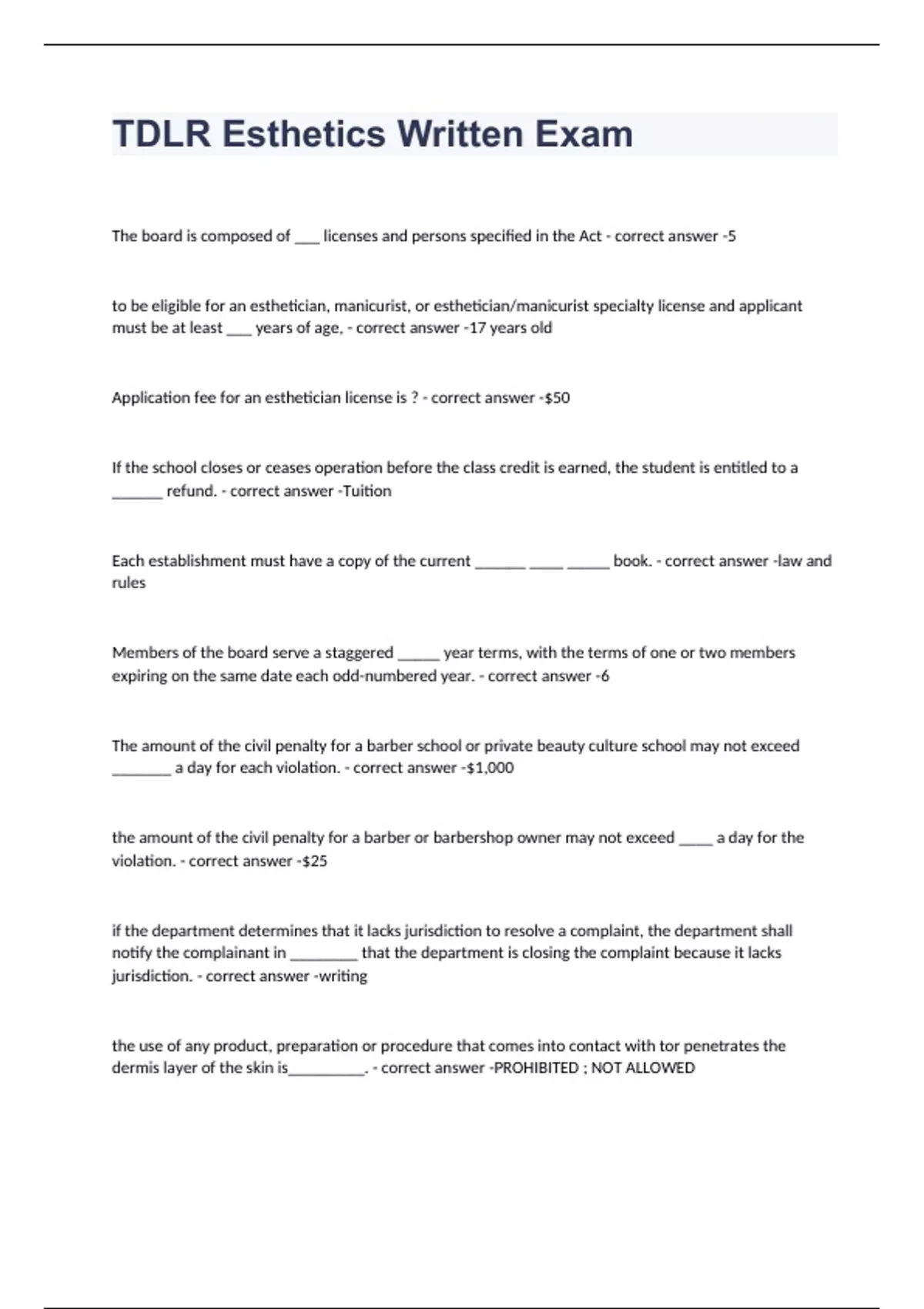 The board is composed of ___ licenses and persons specified in the Act 5 to be eligible for an esthetician, manicurist, or esthetician/manicurist specialty license and applicant must be at least ___ years of age, 17 years old Application fee for an esthetician license is ? $50 If the school closes or ceases operation before the class credit is earned, the student is entitled to a ______ refund. Tuition Each establishment must have a copy of the current ______ ____ _____ book. law and rules Members of the board serve a staggered _____ year terms, with the terms of one or two members expiring on the same date each odd-numbered year. 6 The amount of the civil penalty for a barber school or private beauty culture school may not exceed _______ a day for each violation. $1,000 the amount of the civil penalty for a barber or barbershop owner may not exceed ____ a day for the violation. $25 if the department determines that it lacks jurisdiction to resolve a complaint, the department shall notify the complainant in ________ that the department is closing the complaint because it lacks jurisdiction. writing the use of any product, preparation or procedure that comes into contact with tor penetrates the dermis layer of the skin is_________. PROHIBITED ; NOT ALLOWED