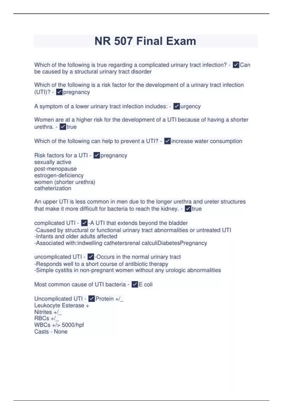 NR 507 Final Exam Which of the following is true regarding a complicated urinary tract infection? - ✅Can be caused by a structural urinary tract disorder Which of the following is a risk factor for the development of a urinary tract infection (UTI)? - ✅pregnancy A symptom of a lower urinary tract infection includes: - ✅urgency Women are at a higher risk for the development of a UTI because of having a shorter urethra. - ✅true Which of the following can help to prevent a UTI? - ✅increase water consumption Risk factors fo r a UTI - ✅pregnancy sexually active post-menopause estrogen -deficiency women (shorter urethra) catheterization An upper UTI is less common in men due to the longer urethra and ureter structures that make it more difficult for bacteria to reach the kidn ey. - ✅true complicated UTI - ✅-A UTI that extends beyond the bladder -Caused by structural or functional urinary tract abnormalities or untreated UTI -Infants and older adults affected -Associated with:indwelling cathetersrenal calculiDiabetesPregnancy uncomplicated UTI - ✅-Occurs in the normal urinary tract -Responds well to a short course of antibiotic therapy -Simple cystitis in non -pregnant women without any urologic abnormalities Most common cause of UTI bacteria - ✅E coli Uncomplicated UTI - ✅Protein +/_ Leukocyte Esterase + Nitrites +/_ RBCs +/_ WBCs +/> 5000/hpf Casts - None Complicated UTI - ✅Protein +/_ Leukocyte Esterase + Nitrites +/_ RBCs + WBCs +/> 100,000/hpf Casts + NP education - ✅-Drink more water. -Although t here are differences of opinions, cranberry juice and vitamin C can help to acidify the urine. -Urinate before and after sexual intercourse to remove bacteria from the urethral area. - Encourage the female to avoid holding urine for extended periods of time -Avoid the use of hygiene sprays and spermicides because they alter the normal microbial flora to enhance the risk for infection. -Encourage the female to wipe from the front to the back after a bowel movement to avoid spreading bacteria to the urethra -Encourages showers rather than bathing to avoid the spread of bacteria. A 25 year - old female presents to the primary care office with urinary burning and frequency for the last 3 days. She denies any fever, chills, back pain. Her gynecological history is negative and reports no vaginal discharge. The only new information reported is that she recently had sexual intercourse with a new male partner. The NP obtains a urinalysis and determines that the urine contains leukocytes, RBCs, nitrites, and WBCs. No c asts are identified. Based on symptom presentation and UA results, the patient can be diagnosed with: - ✅cystitis J.S. is an 80 -year-old patient who resides in a local nursing home. He recently became confused and then fell while ambulating to the bathro om three days ago. Because of his confusion and fall, he was transferred to the acute care facility for evaluation and treatment. Lab work revealed that the patient was very dehydrated with hypernatremia identified and appropriate intravenous fluids starte d. Cystitis was also identified from the urinalysis. He was also noted to have red and excoriated skin between the buttocks and inner thighs due to urinary frequency and dribbling. To help with skin healing and to prevent further urine leakage, an indwelli ng catheter was inserted. Two days after the catheter was placed, the patient spiked a fever of 102 degrees Fahrenheit associated with shaking chills. An intense, foul odor was noted in the urine. On examination of the flank area, the patient yelled out wh en touched. A urine culture was obtained and came back positive for nitrites and RBCs. Urine microscopy revealed >100,000 WBC/hpf and casts. Based on the information provided in the case, the patient can most likely be diagnosed with: - ✅pyelonephritis Identify the major risk factor J.S. has that is associated with pyelonephritis: - ✅indwelling foley catheter The urinalysis of a patient with a complicated UTI will show WBCs and casts - ✅true