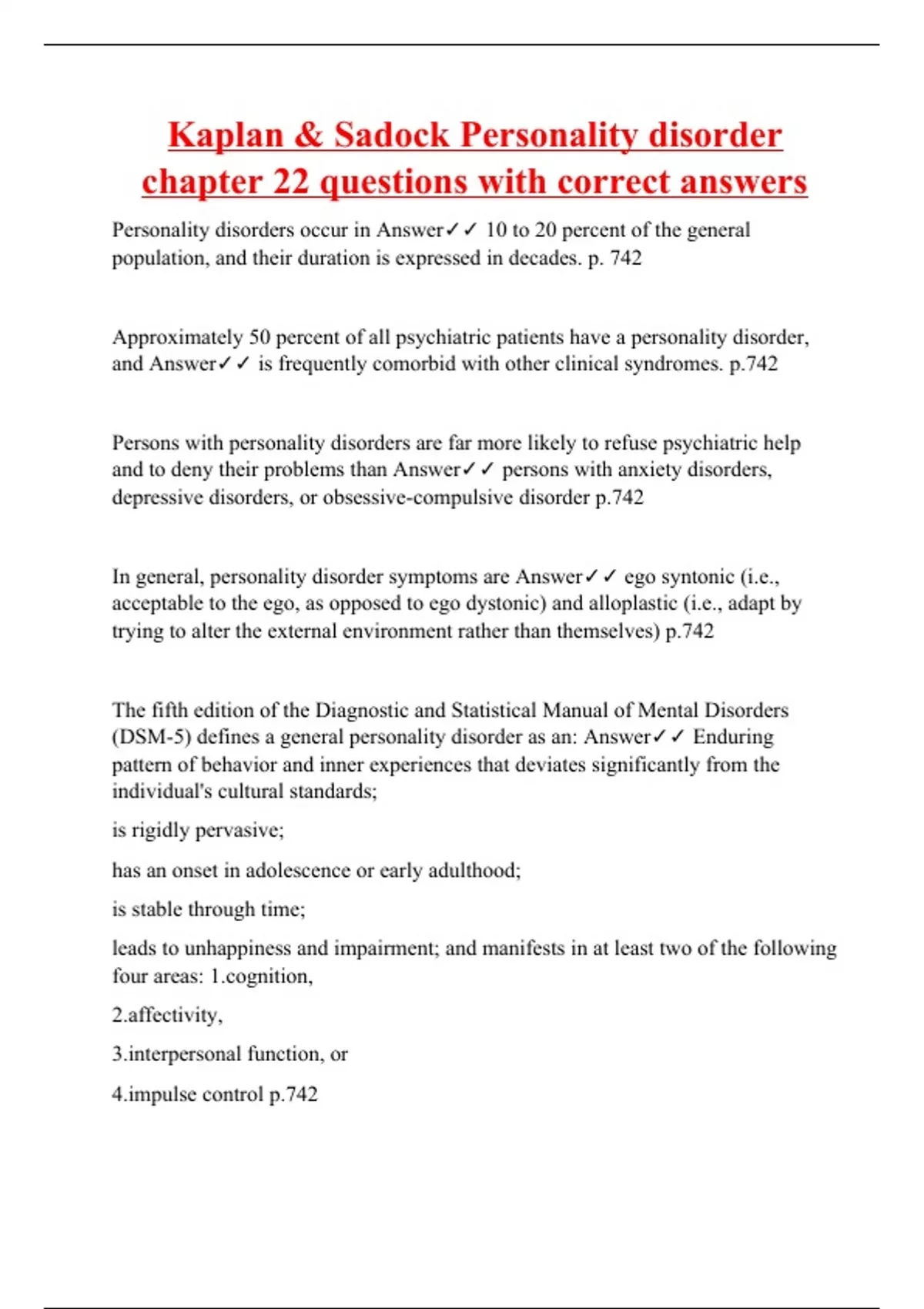 Kaplan & Sadock Personality disorder chapter 22 questions with correct answers