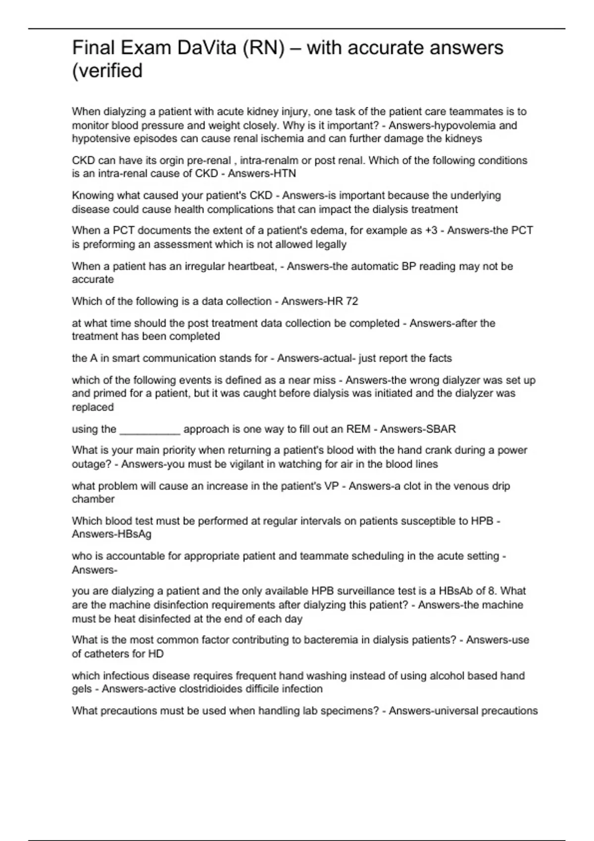 Final Exam DaVita (RN) – with accurate answers (verified)Graded A