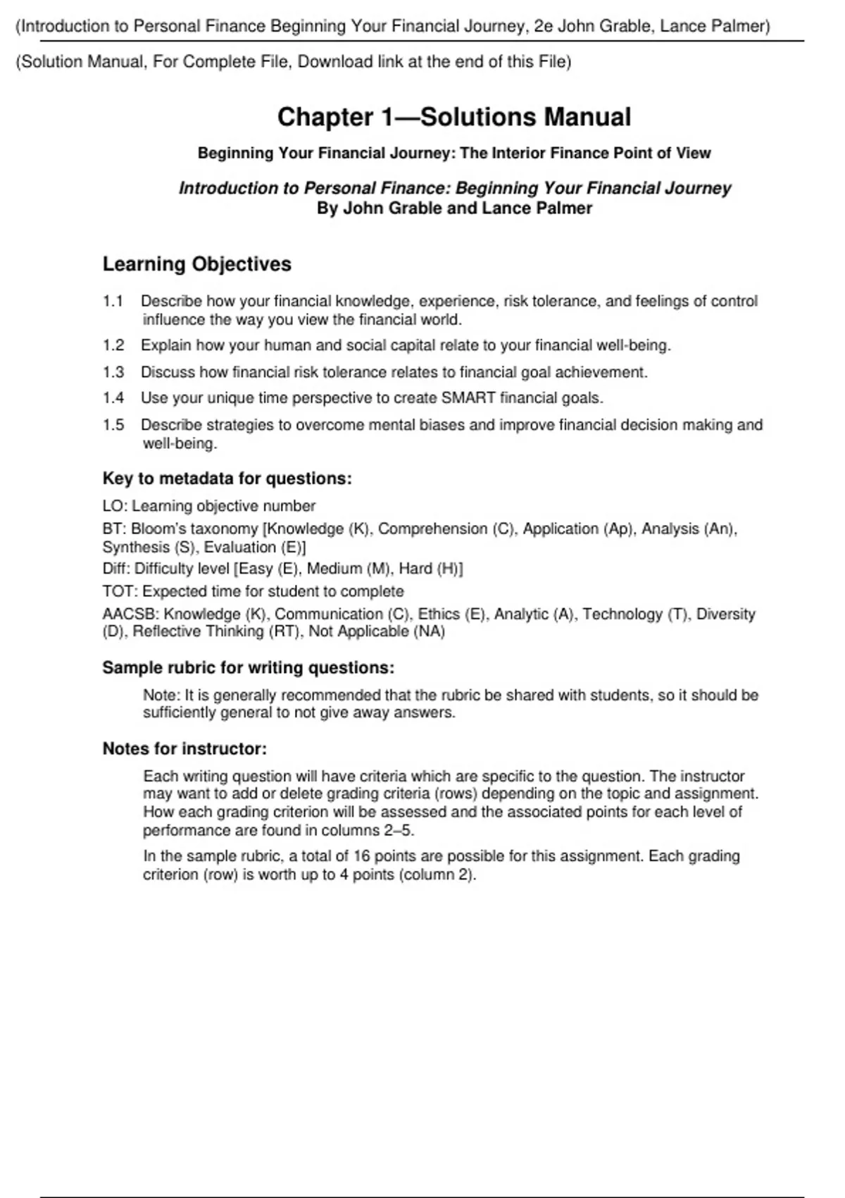 © John Wiley & Sons, Inc. or the author, All rights reserved. Instructors who are authorized users of this course are permitt ed to download these materials and use them in connection with the course . Except as permitted herein or by law, no part of these materials should be reproduced, stored in a retrieval system, or transmitted, in any form or by any means, electronic, mechan ical,photocopying, recording or otherwise.Chapter 1—Solutions Manual Beginning Your Financial Journey: The Interior Finance Point of View Introduction to Personal Finance: Beginning Your Financial Journey By John Grable and Lance Palmer Learning Objectives 1.1 Describe how your financial knowledge, experience, risk tolerance, and feelings of control influence the way you view the financial world. 1.2 Explain how your human and social capital relate to your financial well -being. 1.3 Discuss how financial risk tolerance relates to financial goal achievement . 1.4 Use your unique time perspective to create SMART financial goals . 1.5 Describe strategies to overcome mental biases and improve financial decision making and well-being. Key to metadata for questions: LO: Learning objective number BT: Bloom’s taxonomy [Knowledge (K), Comprehension (C), Application (Ap), Analysis (An), Synthesis (S), Evaluation (E)] Diff: Difficulty level [Easy (E), Medium (M), Hard (H) ] TOT: Expected time for student to compl ete AACSB: Knowledge (K), Communication (C), Ethics (E), Analytic (A), Technology (T), Diversity (D), Reflective Thinking (RT), Not Applicable (NA) Sample rubric for writing questions: Note: It is generally recommended that the rubric be shared with studen ts, so it should be sufficiently general to not give away answers. Notes for instructor: Each writing question will have criteria which are specific to the question. The instructor may want to add or delete grading criteria (rows) depending on the topic an d assignment. How each grading criterion will be assessed and the associated points for each level of performance are found in columns 2 –5. In the sample rubric, a total of 16 points are possible for this assignment. Each grading criterion (row) is worth up to 4 points (column 2). (Introduction to Personal Finance Beginning Your Financial Journey, 2e John Grable, Lance Palmer)