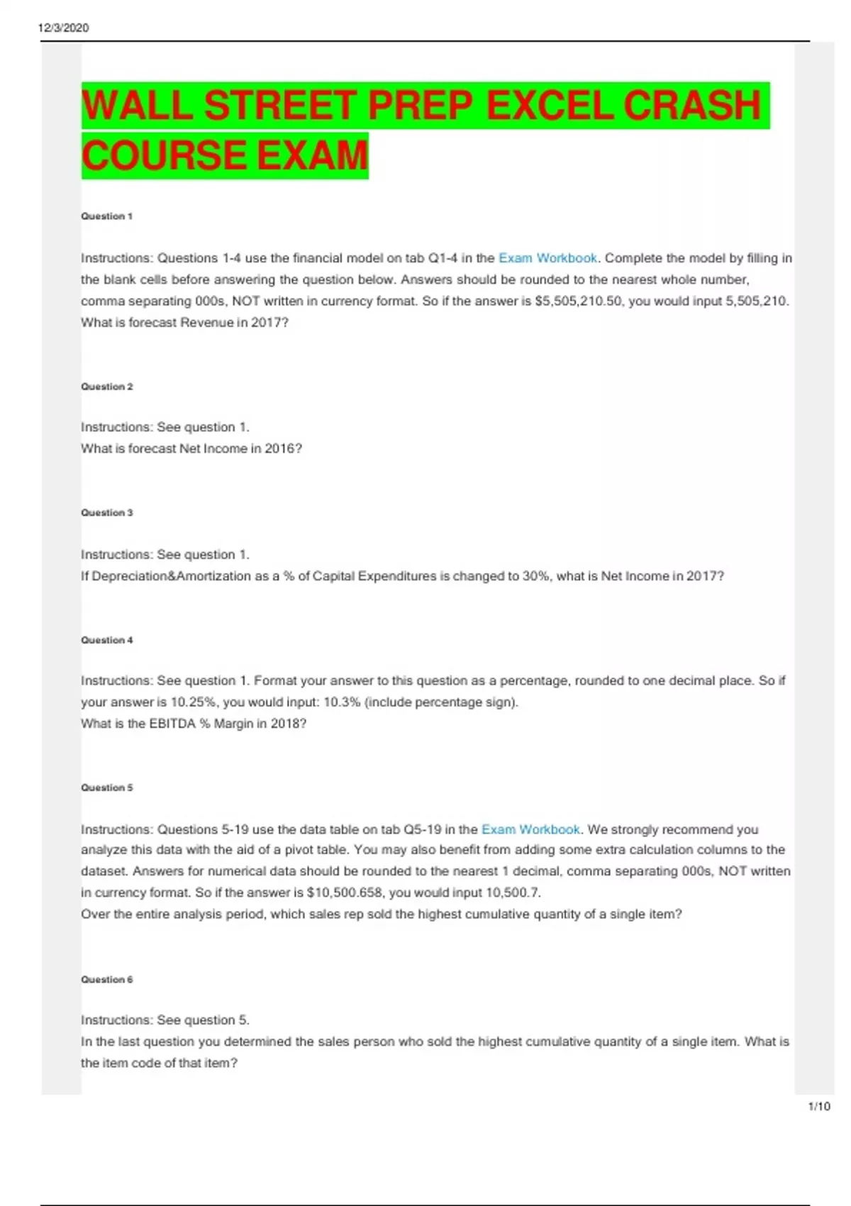 WALL STREET PREP EXCEL CRASH COURSE EXAM Instructions: Questions 1-4 use the financial model on tab Q1-4 in the Exam Workbook. Complete the model by filling in the blank cells before answering the question below. Answers should be rounded to the nearest whole number, comma separating 000s, NOT written in currency format. So if the answer is $5,505,210.50, you would input 5,505,210. What is forecast Revenue in 2017? Question 2 Instructions: See question 1. What is forecast Net Income in 2016? Question 3 Instructions: See question 1. If Depreciation&Amortization as a % of Capital Expenditures is changed to 30%, what is Net Income in 2017? Question 4 Instructions: See question 1. Format your answer to this question as a percentage, rounded to one decimal place. So if your answer is 10.25%, you would input: 10.3% (include percentage sign). What is the EBITDA % Margin in 2018? Question 5 Instructions: Questions 5-19 use the data table on tab Q5-19 in the Exam Workbook. We strongly recommend you analyze this data with the aid of a pivot table. You may also benefit from adding some extra calculation columns to the dataset. Answers for numerical data should be rounded to the nearest 1 decimal, comma separating 000s, NOT written in currency format. So if the answer is $10,500.658, you would input 10,500.7. Over the entire analysis period, which sales rep sold the highest cumulative quantity of a single item? Question 6 Instructions: See question 5. In the last question you determined the sales person who sold the highest cumulative quantity of a single item. What is the item code of that item? 12/3/2020 2/10 Question 7 Instructions: See question 5. Over the entire analysis period, what is the highest selling item code by quantity? Question 8 Instructions: See question 5. Over the entire analysis period, what is the second highest selling item code by quantity? Question 9 Instructions: See question 5. Only considering postal codes 93372, 93403 and 93434, which postal code had the highest total profit during the month of March? Question 10 Instructions: See question 5. Your answer for this question should be rounded to the nearest 1 decimal, comma separating 000s, NOT written in currency format. So if the answer is