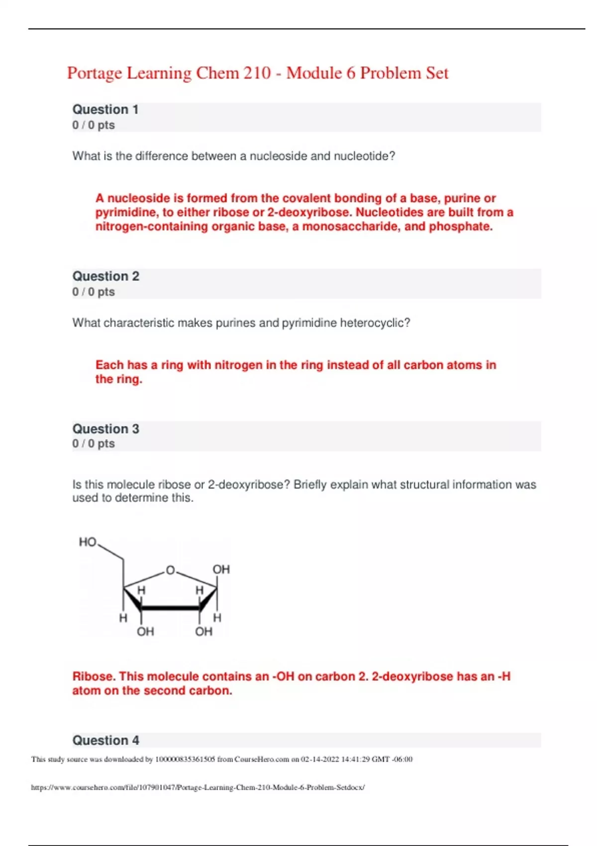 This study source was downloaded by from CourseH on :41:29 GMT -06:00 Portage Learning Chem 210 - Module 6 Problem Set What is the difference between a nucleoside and nucleotide? A nucleoside is formed from the covalent bonding of a base, purine or pyrimidine, to either ribose or 2-deoxyribose. Nucleotides are built from a nitrogen-containing organic base, a monosaccharide, and phosphate. What characteristic makes purines and pyrimidine heterocyclic? Each has a ring with nitrogen in the ring instead of all carbon atoms in the ring. Is this molecule ribose or 2-deoxyribose? Briefly explain what structural information was used to determine this. Ribose. This molecule contains an -OH on carbon 2. 2-deoxyribose has an -H atom on the second carbon. Question 4 Question 1 0 / 0 pts Question 2 0 / 0 pts Question 3 0 / 0 pts This study source was downloaded by from CourseH on :41:29 GMT -06:00 Is the following a pyrimidine or purine? Provide the name and one-letter symbol. Pyrimidine. It is thymine (T). What is the difference between thymine and uracil? These two bases differ by a methyl group. Thymine has an extra methyl group on the ring. 0 / 0 pts Question 5 0 / 0 pts Question 6 0 / 0 pts This study source was downloaded by from CourseH on :41:29 GMT -06:00 From the course and module information, where in a eukaryotic or prokaryotic cell, is the DNA located? How about the RNA? DNA is located in the nucleus of a eukaryotic cell or the nucleoid of a prokaryotic cell. RNA is found in the nucleus, on the ribosome, and in other parts of the cell. Which DNA and RNA bases contain a carbonyl group? Guanine, cytosine, thymine, and uracil all contain C=O group attached to the rings. Adenine is the only base that does not. What constitutes the backbone of DNA? In DNA, this consists of the alternating deoxyribose and phosphate groups linked together through covalent bonds (Figure 6.6). How many hydrogen bonds form between A and T? Question 7 0 / 0 pts Question 8 0 / 0 pts Question 9 0 / 0 pts This study source was downloaded by from CourseH on :41:29 GMT -06:00 Two hydrogen bonds are formed between these two bases. G and C form three H-bonds. Which nucleic acid is single-stranded? RNA. RNA forms single strands. Particularly this was noted in this module for tRNA. DNA forms a double helix. What interactions stabilize the DNA double helix? Hydrogen bonds stabilize the helix. Each AT pair and form two hydrogen bonds, and each GC pair forms three hydrogens that stabilize the helix, permitting it to maintain this shape. What type of RNA has a sequence that is complementary to DNA? mRNA is complementary so that it can transmit the information to the ribosome. Question 10 0 / 0 pts Question 11 0 / 0 pts Question 12 0 / 0 pts This study source was downloaded by from CourseH on :41:29 GMT -06:00 Which has the largest molecular weight chains: mRNA, tRNA, or rRNA? rRNA. These molecules make up ribosomes. What structural forms of DNA have a right-handed helix? Which form has a left-handed helix? The A- and B-forms are right-handed, while the Z-form is left-handed. What function does cAMP perform in cells? cAMP is a communication molecule in cellular signaling. It acts as a secondary messenger. Question 13 0 / 0 pts Question 14 0 / 0 pts Question 15 0 / 0 pts