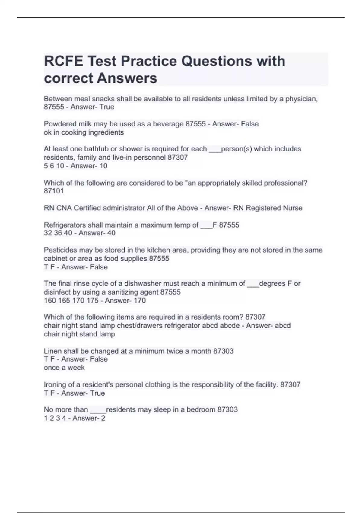 RCFE Test Practice (200 Questions) With 100% Correct & Verified Answers