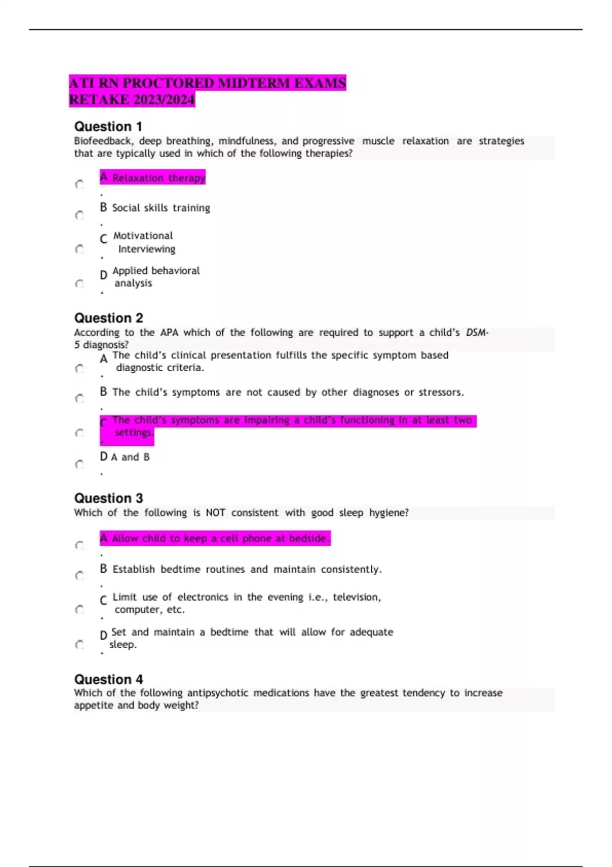 ATI RN PROCTORED MIDTERM EXAMS RETAKE 2023/2024 Question 1 A Relaxation therapy . B Social skills training . C Motivational . Interviewing D Applied behavioral . analysis Question 2 A The child’s clinical presentation fulfills the specific symptom based . diagnostic criteria. B The child’s symptoms are not caused by other diagnoses or stressors. . C The child’s symptoms are impairing a child’s functioning in at least two . settings. D A and B . Question 3 Which of the following is NOT consistent with good sleep hygiene? A Allow child to keep a cell phone at bedside. . B Establish bedtime routines and maintain consistently. . C Limit use of electronics in the evening i.e., television, . computer, etc. D Set and maintain a bedtime that will allow for adequate . sleep. Question 4 A Aripiprazole (Abilify) . B Ziprasidone . (Geodon) C Haloperidol (Haldol) . D Risperidone . (Risperdal) Question 5 A Safety . B Bullying . C Conduct disorder . D Oppositional defiant . disorder Question 6 A Substance use disorder . B Substance withdrawal . C Substance tolerance . D Substance induced mental . disorder Question 7 A Become a surrogate decision maker for the patient. . B Consult a formally-designated surrogate for patient choices. . C Make safe choices for the patient based on the nurse’s beliefs . and values. D Continue to support all the patient’s choices until a surrogate . can be found. Question 8 A Obsessive -compulsive . disorder B Posttraumatic stress . disorder C Panic disorder . D Separation anxiety . disorder Question 9 A Ziprasidone . (Geodon) B Aripiprazole . (Abilify) C Olanzapine . (Zyprexa) D Quetiapine . (Seroquel) Question 10 A Bipolar II Disorder . B Cyclothymic Disorder . C Bipolar I Disorder, mixed . episode D Bipolar I Disorder, cyclothymic . type Question 11 Which of the following is NOT true about symptomatology of anorexia nervosa? A Most aberrant behaviors directed toward losing weight occurs in secret. . B All patients have an intense fear of gaining weight and becoming obese. . C Most patients with anorexia nervosa will have no difficulty eating with their family in . public places. D Fear of gaining weight and becoming obese frequently contributes to the individual’s . lack of interest in and resistance to therapy/treatment. Question 12 Sleep-related hallucinations occurring at sleep onset are known as which of the following? A Hypnagogic . B Hypnopompic . C Complex . hallucinations D Paranormal . hallucinations Question 13 A Cognitive theory . B Psychosocial theory . C Psychodynamic theory . D Learned helplessness . theory Question 14 A Stigma associated with mental health . B Poor problem recognition . C Limited availability of mental health . specialists D All of the above . Question 15 A Asking about a child and caregiver’s cultural understanding is an efficient way to . build a therapeutic alliance. B While cultural understanding is important, it is important not to personalize the . diagnosis. C While obtaining cultural information is important, it may increase bias and thus . decrease accuracy of the assessment. D Engaging in a discussion about culture, while interesting and engaging, is a . distraction from the problem that brought the child and caregiver to the provider. Question 16 ..................................................................................................CONTINUE