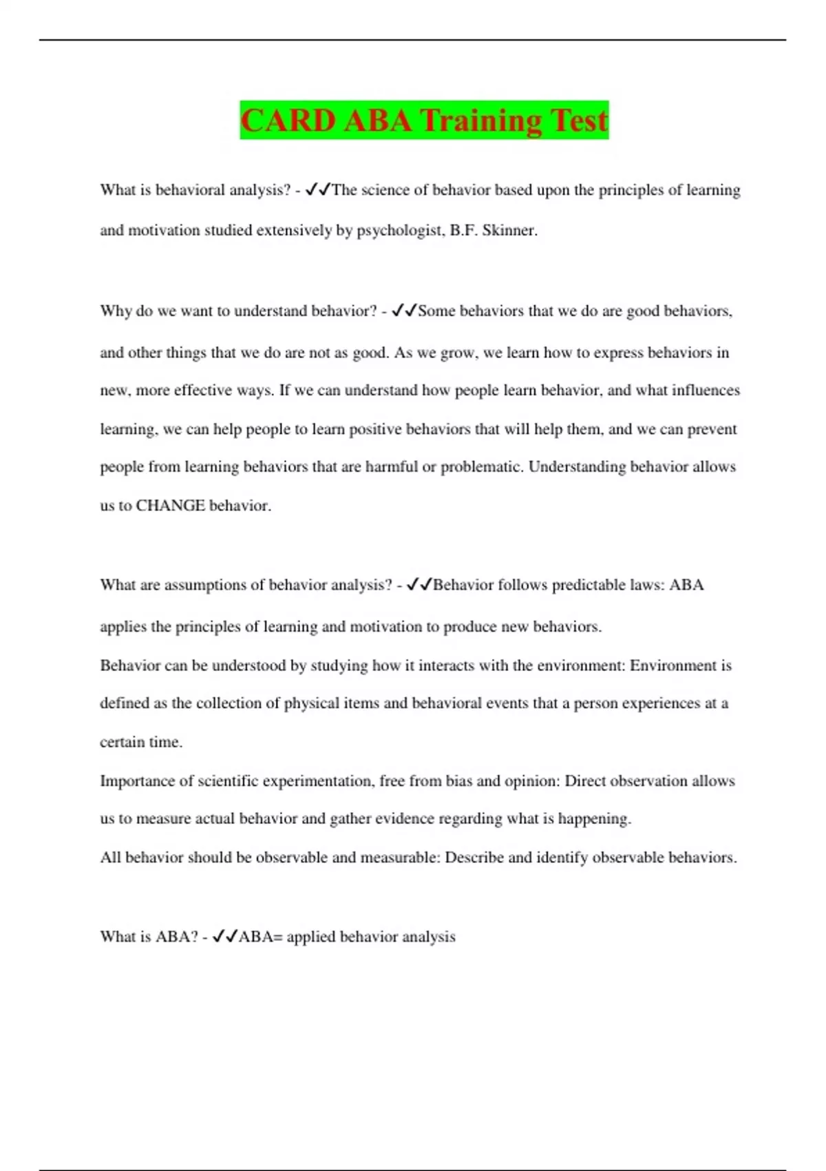 CARD ABA Training Test | 120 Questions with 100% Correct Answers | Updated & Verified | 28 Pages