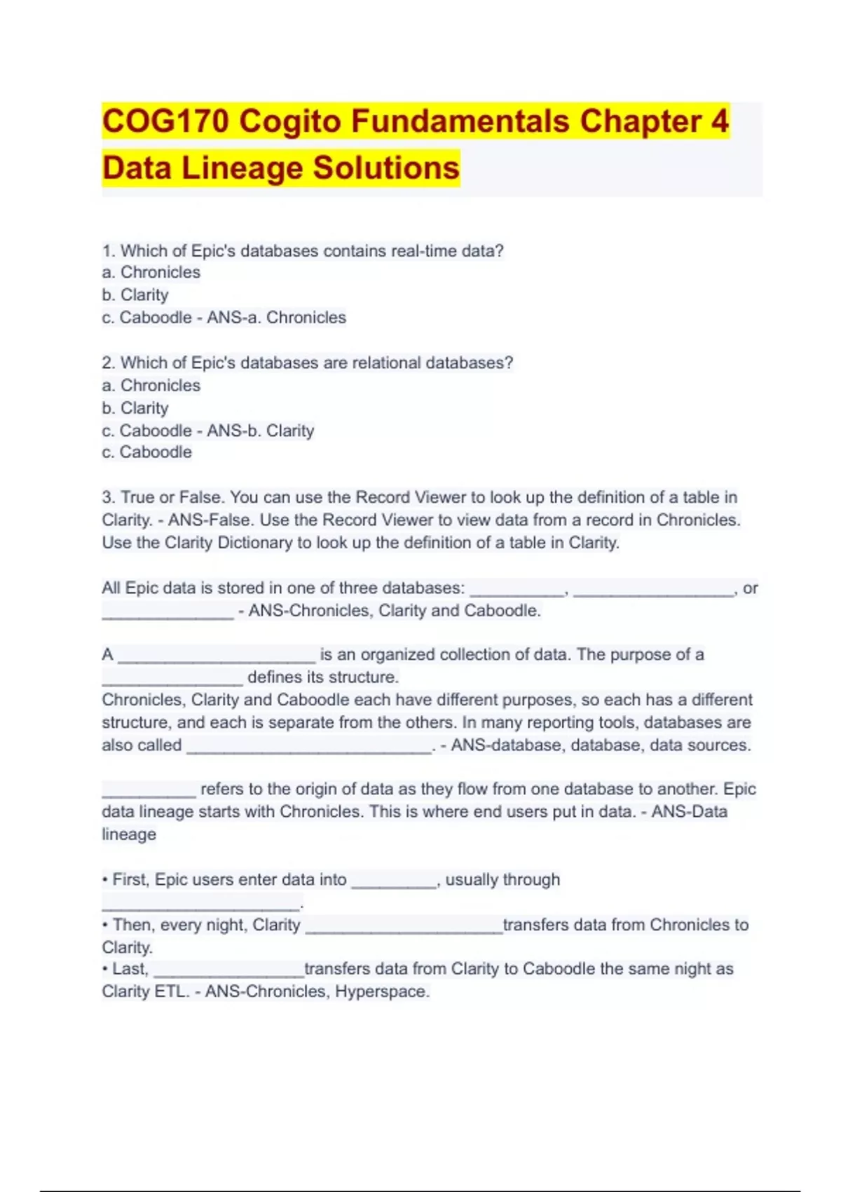 COG170 Cogito Fundamentals Chapter 4 Data Lineage Solutions 1. Which of Epic's databases contains real-time data? a. Chronicles b. Clarity c. Caboodle - ANS-a. Chronicles