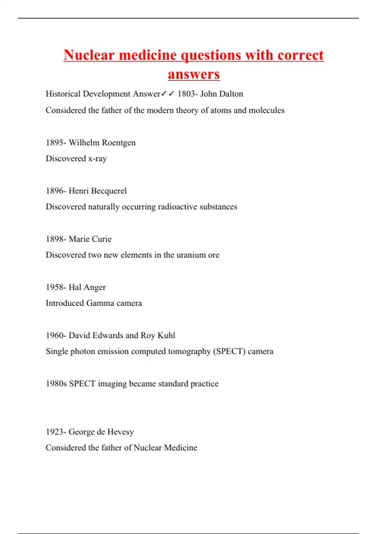 Historical Development Answer 1803- John Dalton Considered the father of the modern theory of atoms and molecules 1895- Wilhelm Roentgen Discovered x-ray 1896- Henri Becquerel Discovered naturally occurring radioactive substances 1898- Marie Curie Discovered two new elements in the uranium ore 1958- Hal Anger Introduced Gamma camera 1960- David Edwards and Roy Kuhl Single photon emission computed tomography (SPECT) camera 1980s SPECT imaging became standard practice 1923- George de Hevesy Considered the father of Nuclear Medicine