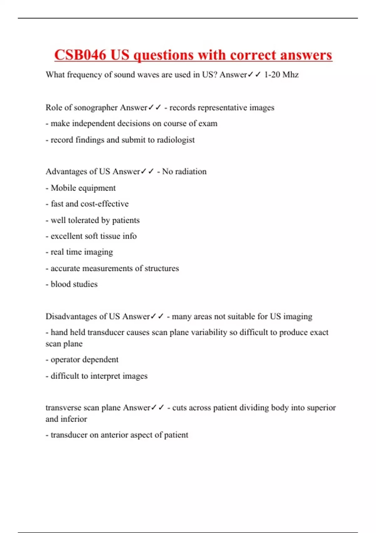 What frequency of sound waves are used in US? Answer 1-20 Mhz Role of sonographer Answer - records representative images - make independent decisions on course of exam - record findings and submit to radiologist Advantages of US Answer - No radiation - Mobile equipment - fast and cost-effective - well tolerated by patients - excellent soft tissue info - real time imaging - accurate measurements of structures - blood studies Disadvantages of US Answer - many areas not suitable for US imaging - hand held transducer causes scan plane variability so difficult to produce exact scan plane - operator dependent - difficult to interpret images transverse scan plane Answer - cuts across patient dividing body into superior and inferior - transducer on anterior aspect of patient