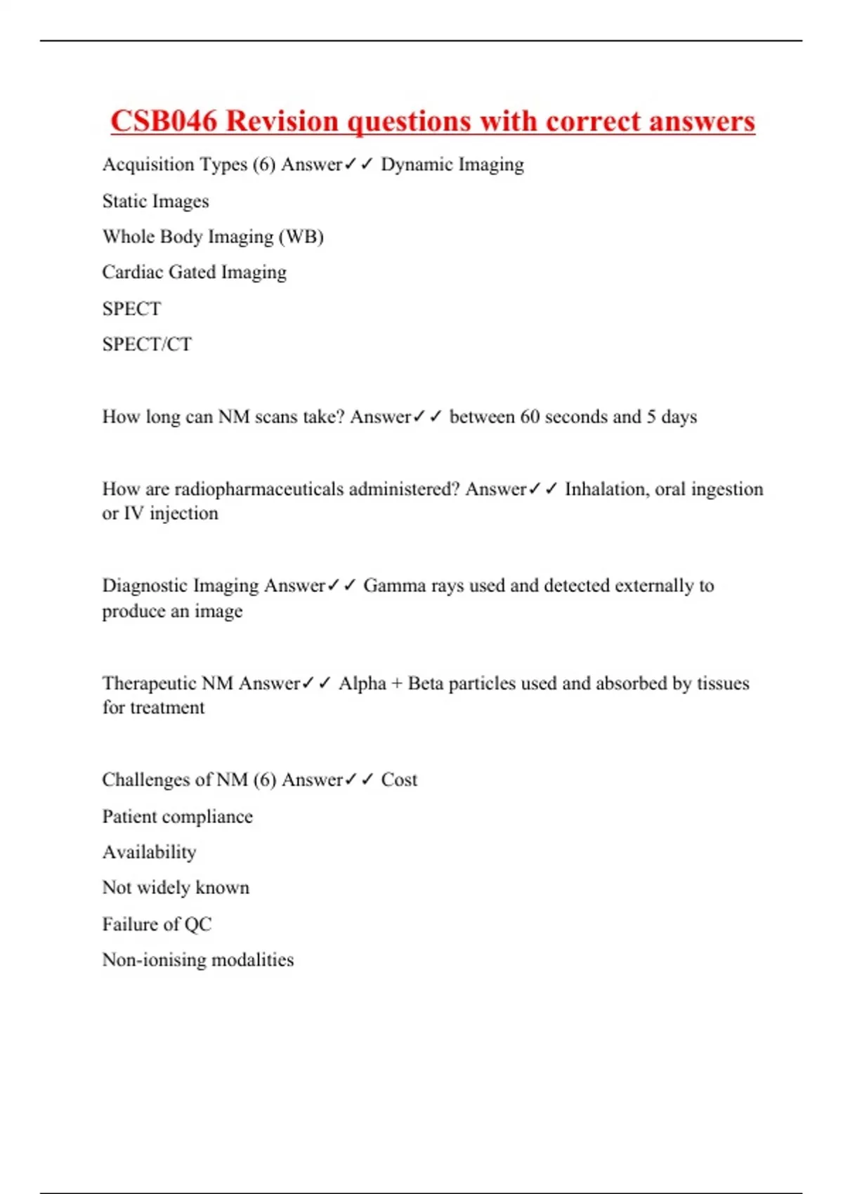 Acquisition Types (6) Answer Dynamic Imaging Static Images Whole Body Imaging (WB) Cardiac Gated Imaging SPECT SPECT/CT How long can NM scans take? Answer between 60 seconds and 5 days How are radiopharmaceuticals administered? Answer Inhalation, oral ingestion or IV injection Diagnostic Imaging Answer Gamma rays used and detected externally to produce an image Therapeutic NM Answer Alpha + Beta particles used and absorbed by tissues for treatment Challenges of NM (6) Answer Cost Patient compliance Availability Not widely known Failure of QC Non-ionising modalities
