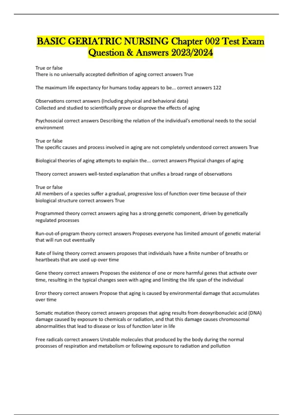 BASIC GERIATRIC NURSING Chapter 002 Test Exam Question & Answers 2023/2024 True or false There is no universally accepted definition of aging correct answers True The maximum life expectancy for humans today appears to be... correct answers 122 Observations correct answers (Including physical and behavioral data) Collected and studied to scientifically prove or disprove the effects of aging Psychosocial correct answers Describing the relation of the individual's emotional needs to the social environment True or false The specific causes and process involved in aging are not completely understood correct answers True Biological theories of aging attempts to explain the... correct answers Physical changes of aging Theory correct answers well-tested explanation that unifies a broad range of observations True or false All members of a species suffer a gradual, progressive loss of function over time because of their biological structure correct answers True Programmed theory correct answers aging has a strong genetic component, driven by genetically regulated processes Run-out-of-program theory correct answers Proposes everyone has limited amount of genetic material that will run out eventually Rate of living theory correct answers proposes that individuals have a finite number of breaths or heartbeats that are used up over time Gene theory correct answers Proposes the existence of one or more harmful genes that activate over time, resulting in the typical changes seen with aging and limiting the life span of the individual Error theory correct answers Propose that aging is caused by environmental damage that accumulates over time Somatic mutation theory correct answers proposes that aging results from deoxyribonucleic acid (DNA) damage caused by exposure to chemicals or radiation, and that this damage causes chromosomal abnormalities that lead to disease or loss of function later in life