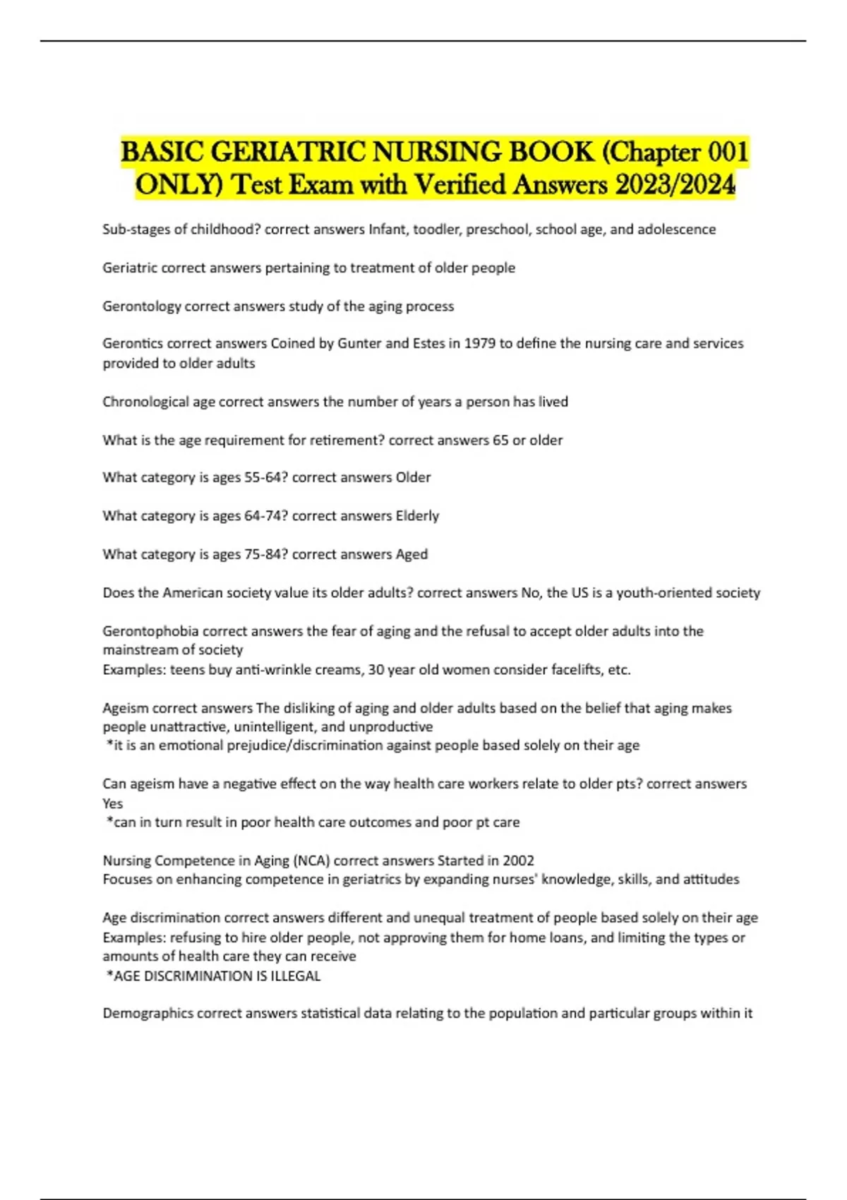BASIC GERIATRIC NURSING BOOK (Chapter 001 ONLY) Test Exam with Verified Answers 2023/2024 Sub-stages of childhood? correct answers Infant, toodler, preschool, school age, and adolescence Geriatric correct answers pertaining to treatment of older people Gerontology correct answers study of the aging process Gerontics correct answers Coined by Gunter and Estes in 1979 to define the nursing care and services provided to older adults Chronological age correct answers the number of years a person has lived What is the age requirement for retirement? correct answers 65 or older What category is ages 55-64? correct answers Older What category is ages 64-74? correct answers Elderly What category is ages 75-84? correct answers Aged Does the American society value its older adults? correct answers No, the US is a youth-oriented society Gerontophobia correct answers the fear of aging and the refusal to accept older adults into the mainstream of society Examples: teens buy anti-wrinkle creams, 30 year old women consider facelifts, etc. Ageism correct answers The disliking of aging and older adults based on the belief that aging makes people unattractive, unintelligent, and unproductive *it is an emotional prejudice/discrimination against people based solely on their age Can ageism have a negative effect on the way health care workers relate to older pts? correct answers Yes *can in turn result in poor health care outcomes and poor pt care Nursing Competence in Aging (NCA) correct answers Started in 2002 Focuses on enhancing competence in geriatrics by expanding nurses' knowledge, skills, and attitudes Age discrimination correct answers different and unequal treatment of people based solely on their age Examples: refusing to hire older people, not approving them for home loans, and limiting the types or amounts of health care they can receive *AGE DISCRIMINATION IS ILLEGAL Demographics correct answers statistical data relating to the population and particular groups within it Demographers are concerned with a population's size, distribution, and vital statistics (birth, death, age at death, marriages, race) Life expectancy correct answers the number of years a person can be expected to live Projected from the time of birth The life expectancy throughout history has been low because... correct answers -environmental hazards -wars -accidents -food and water scarcity -inadequate sanitation -contagious diseases