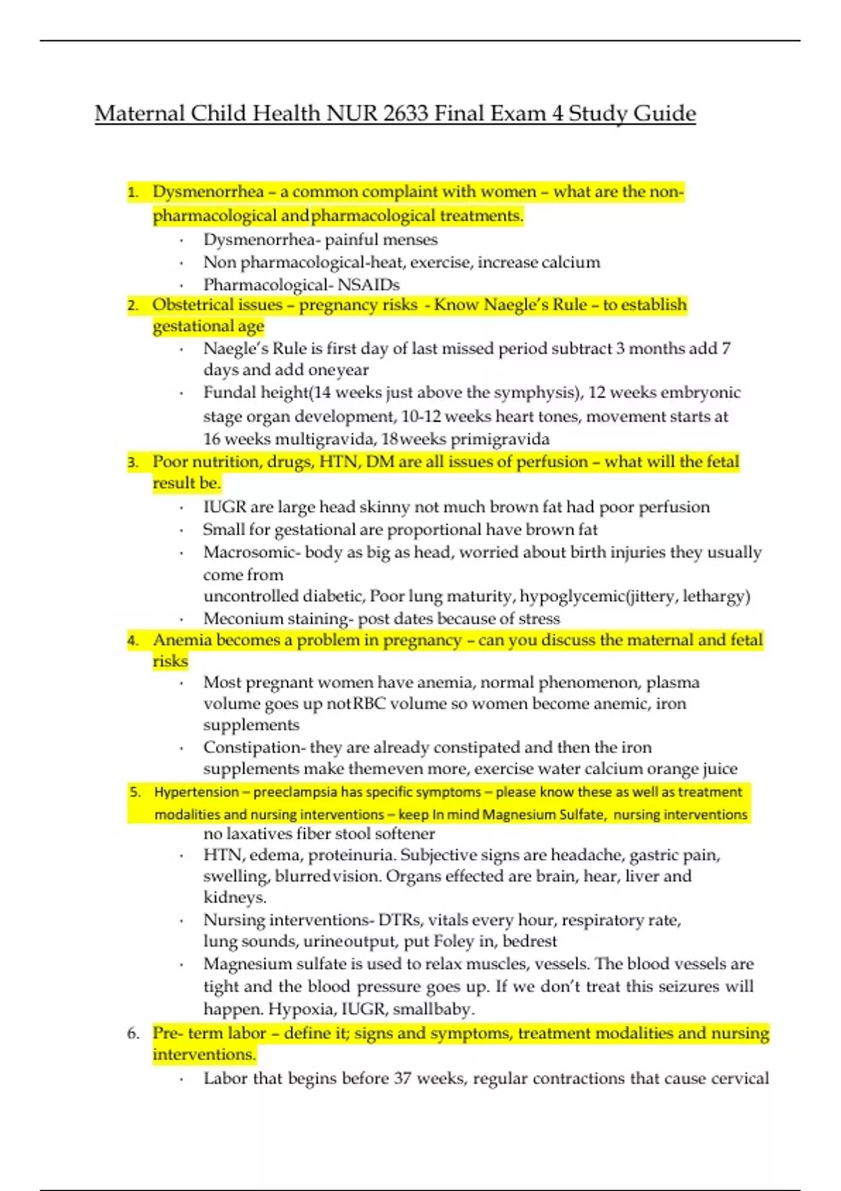 Maternal Child Health NUR 2633 Final Exam 4 Study Guide.1. Dysmenorrhea – a common complaint with women – what are the nonpharmacological and pharmacological treatments. • Dysmenorrhea- painful menses • Non pharmacological-heat, exercise, increase calcium • Pharmacological- NSAIDs 2. Obstetrical issues – pregnancy risks - Know Naegle’s Rule – to establish gestational age • Naegle’s Rule is first day of last missed period subtract 3 months add 7 days and add one year • Fundal height(14 weeks just above the symphysis), 12 weeks embryonic stage organ development, 10-12 weeks heart tones, movement starts at 16 weeks multigravida, 18 weeks primigravida 3. Poor nutrition, drugs, HTN, DM are all issues of perfusion – what will the fetal result be. • IUGR are large head skinny not much brown fat had poor perfusion • Small for gestational are proportional have brown fat • Macrosomic- body as big as head, worried about birth injuries they usually come from uncontrolled diabetic, Poor lung maturity, hypoglycemic(jittery, lethargy) • Meconium staining- post dates because of stress 4. Anemia becomes a problem in pregnancy – can you discuss the maternal and fetal risks • Most pregnant women have anemia, normal phenomenon, plasma volume goes up not RBC volume so women become anemic, iron supplements • Constipation- they are already constipated and then the iron supplements make them even more, exercise water calcium orange juice no laxatives fiber stool softener • HTN, edema, proteinuria. Subjective signs are headache, gastric pain, swelling, blurred vision. Organs effected are brain, hear, liver and kidneys. • Nursing interventions- DTRs, vitals every hour, respiratory rate, lung sounds, urine output, put Foley in, bedrest • Magnesium sulfate is used to relax muscles, vessels. The blood vessels are tight and the blood pressure goes up. If we don’t treat this seizures will happen. Hypoxia, IUGR, small baby. 6. Pre- term labor – define it; signs and symptoms, treatment modalities and nursing interventions.