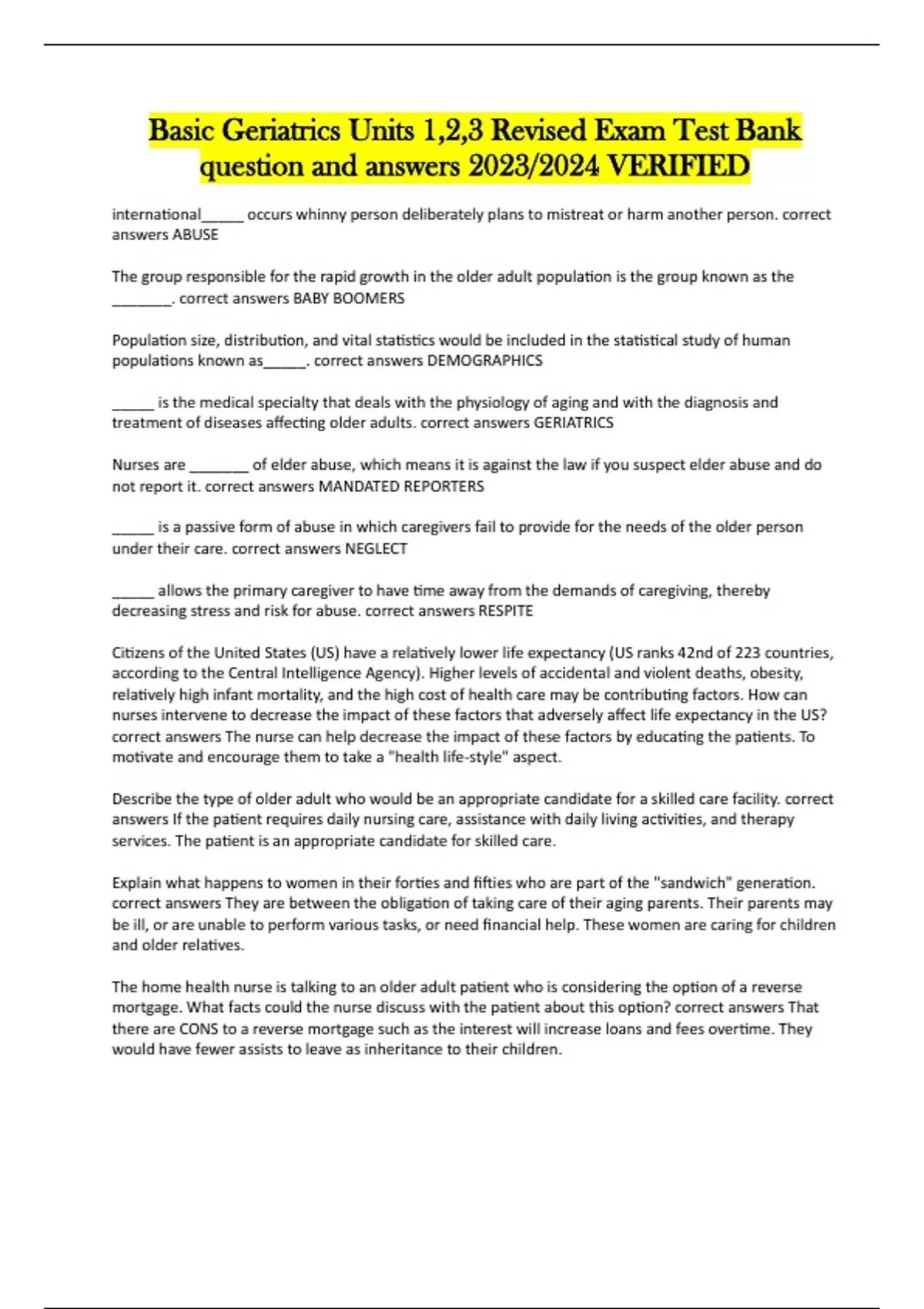 Basic Geriatrics Units 1,2,3 Revised Exam Test Bank question and answers 2023/2024 VERIFIED