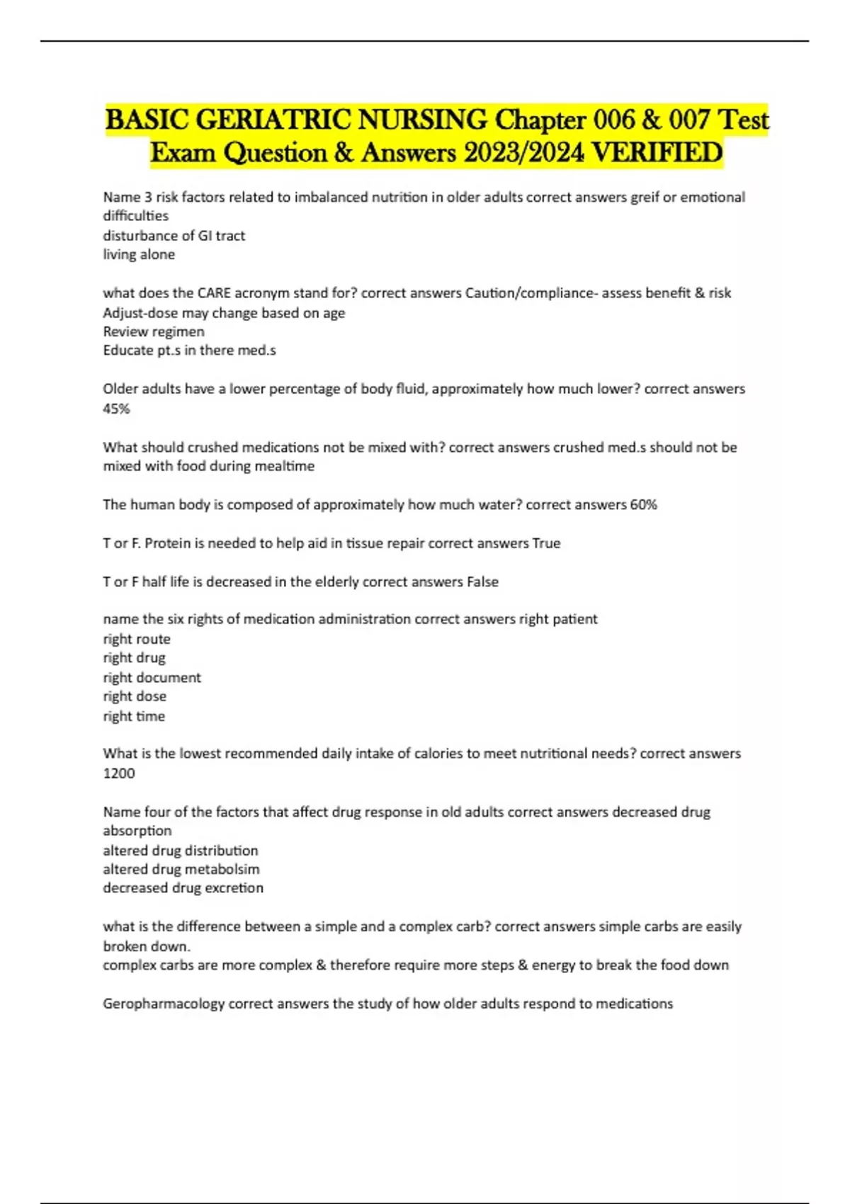 BASIC GERIATRIC NURSING Chapter 006 & 007 Test Exam Question & Answers 2023/2024 VERIFIED Name 3 risk factors related to imbalanced nutrition in older adults correct answers greif or emotional difficulties disturbance of GI tract living alone what does the CARE acronym stand for? correct answers Caution/compliance- assess benefit & risk Adjust-dose may change based on age Review regimen Educate pt.s in there med.s Older adults have a lower percentage of body fluid, approximately how much lower? correct answers 45% What should crushed medications not be mixed with? correct answers crushed med.s should not be mixed with food during mealtime The human body is composed of approximately how much water? correct answers 60% T or F. Protein is needed to help aid in tissue repair correct answers True T or F half life is decreased in the elderly correct answers False name the six rights of medication administration correct answers right patient right route right drug right document right dose right time What is the lowest recommended daily intake of calories to meet nutritional needs? correct answers 1200 Name four of the factors that affect drug response in old adults correct answers decreased drug absorption altered drug distribution altered drug metabolsim decreased drug excretion what is the difference between a simple and a complex carb? correct answers simple carbs are easily broken down. complex carbs are more complex & therefore require more steps & energy to break the food down Geropharmacology correct answers the study of how older adults respond to medications risk factors for aspiration in the elderly correct answers neurologic problems decreased level of consciousness supine postion gastric tubes decreased gastric mobility