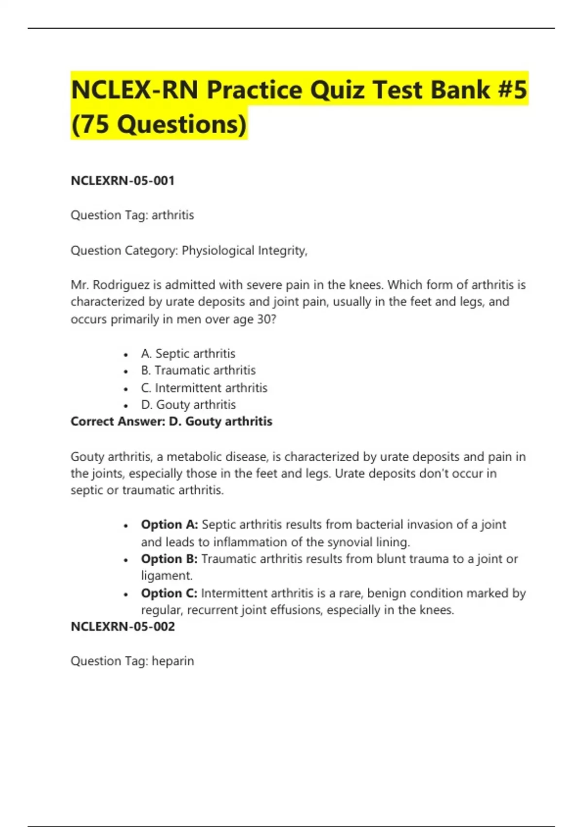 Question Category: Physiological Integrity, Mr. Rodriguez is admitted with severe pain in the knees. Which form of arthritis is characterized by urate deposits and joint pain, usually in the feet and legs, and occurs primarily in men over age 30? A. Septic arthritis B. Traumatic arthritis C. Intermittent arthritis D. Gouty arthritis Correct Answer: D. Gouty arthritis