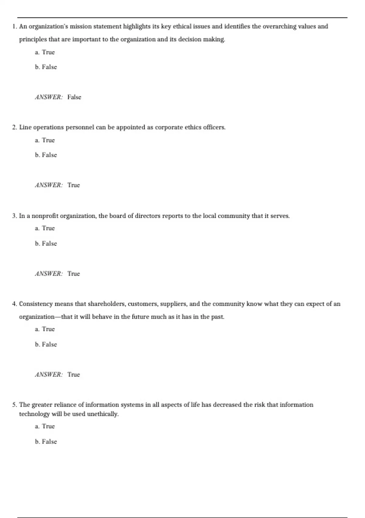 1. An organization’s mission statement highlights its key ethical issues and identifies the overarching values and