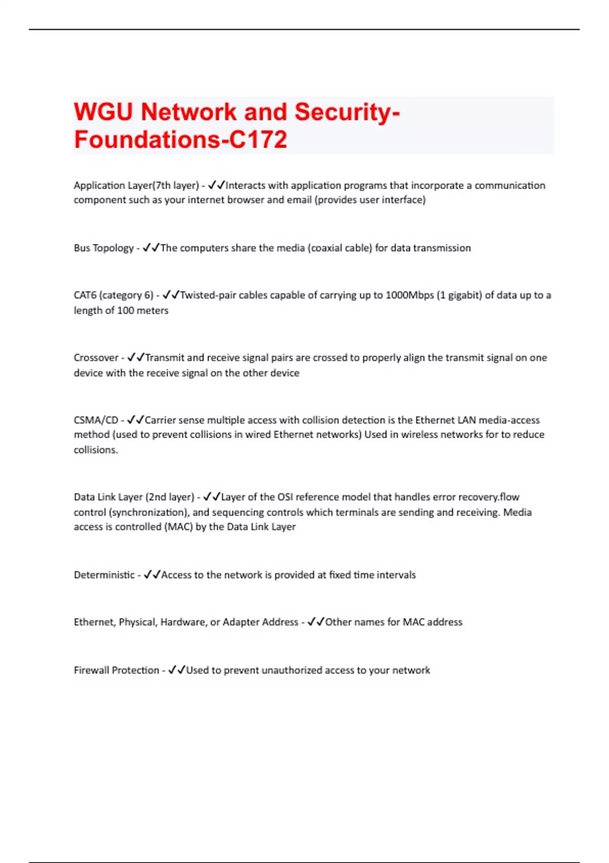 Foundations -C172 Application Layer(7th layer) - ✔✔Interacts with application programs that incorporate a communication component such as your internet browser and email (provides user interface) Bus Topology - ✔✔The computers share the media (coaxial cable) for data transmission CAT6 (category 6) - ✔✔Twisted -pair cables capable of carrying up to 1000Mbps (1 gigabit) of data up to a length of 100 meters Crossover - ✔✔Transmit and receive signal p airs are crossed to properly align the transmit signal on one device with the receive signal on the other device CSMA/CD - ✔✔Carrier sense multiple access with collision detection is the Ethernet LAN media -access method (used to prevent collisions in wire d Ethernet networks) Used in wireless networks for to reduce collisions. Data Link Layer (2nd layer) - ✔✔Layer of the OSI reference model that handles error recovery.flow control (synchronization), and sequencing controls which terminals are sending and r eceiving. Media access is controlled (MAC) by the Data Link Layer Deterministic - ✔✔Access to the network is provided at fixed time intervals Ethernet, Physical, Hardware, or Adapter Address - ✔✔Other names for MAC address Firewall Protection - ✔✔Used t o prevent unauthorized access to your network Host Address/Number - ✔✔The portion of the IP address that defines the location of the networking device connected to the network also called the hose address Hotspots - ✔✔A limited geographic area that provi des wireless access for the public Hub - ✔✔Broadcasts the data it receives to all devices connected to its ports... it is possible for network devices to pick up a data intended for a different device... considered a multiport repeater. Is on the Physical Layer (layer 1) IANA - ✔✔The Internet Assigned Numbers Authority is the agency that assigns IP addresses to computer networks ICMP - ✔✔Internet Control Message Protocol (preform diagnostics, report errors, control the flow of data in the network) IEEE - ✔✔Institute of Electrical and Electronics Engineers, on of the major standard -setting bodies for technological development Intranet - ✔✔An internal network the provides file and resource sharing but it's not accessed from the internet IP Address - ✔✔Unique 32 -bit address the identifies on which network the computer is located as well as differentiate the computer from all oth er devices on the same network; they are logical addresses and can be found using the ipconfig/all command IP Internetwork - ✔✔A network that uses IP addressing for identifying devices connected to the network ipconfig/all - ✔✔Enables the MAC address inf ormation to be displayed from the command prompt ISP - ✔✔Internet service provider Link Integrity Test - ✔✔Protocol used to verify that a communication link between two Ethernet devices has been established. Link Light - ✔✔Indicates that the transmit an d receive pairs are properly aligned Link Pulses - ✔✔Sent by each of the connected devices via the twisted -pair cables when data is not being transmitted to indicate that the link is still up Local Area Network (LAN) - ✔✔Network of users that share compu ter resources in a limited area MAC Address - ✔✔A unique 6 -byte address assigned by the vendor of the network interface card; A MAC address has two portions. The OUI is comprised of the first 6 digits and the last half is assigned by the manufacturer. Mbps - ✔✔Megabits per second Mesh Topology - ✔✔All networking devices are directly connected to each other (fault tolerant; stations can still communicate if some segments go down) Multiport Repeater - ✔✔Another name for a hub Network Address Translation (NAT) - ✔✔Translates the private IP address to a public address for routing over the internet Network Interface Card(NIC) - ✔✔The electronic hardware used to interface the computer to the network Network Layer (3rd layer) - ✔✔Defines how data packets are routed in a network. Accepts outgoing messages and combines messages or segments into packets, adding a header that includes routing information (provides a logical path for data) Network Number - ✔✔The portion of the IP address that defines which network the IP packet is originating from or being delivered to Organizationally Unique Identifier (OUI) - ✔✔The first 3 bytes of the MAC address the identifies the manufacturer of the network hardware ( ex. Network interface card has MAC address of 00 -00-86-15-7A, the OUI is 00 -00-86) OSI - ✔✔Open system interconnect OSI Model - ✔✔The seven layers describing network funcations overloading - ✔✔Where NAT translates the home network's private IP addresses to a single public IP address Packet - ✔✔Provides grouping of the information for transmission Physical Layer (1st layer) - ✔✔Layer of the OSI reference model that provides the electrical and mechanical connection to the network Describes the media that interconnects networking devices Ping - ✔✔Command used to test that a device on the network is reachable (If you can't connect to a networked computer, you can use the ping command to check connectivity) Used in windows in the command window Port addres s Translation (PAT) - ✔✔A port number is tracked with the client computer's private address when translating to a public address Ports - ✔✔The physical input/output interfaces to the networking hardware Presentation Layer (6th layer) - ✔✔Layer of the OSI reference model that accepts and structures the messages for the application