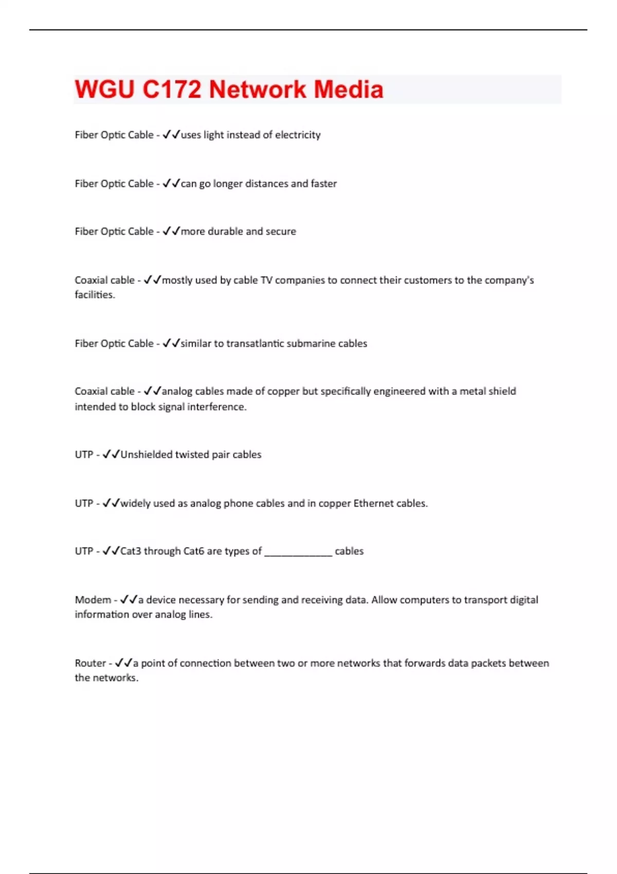 Fiber Optic Cable - uses light instead of electricity Fiber Optic Cable - can go longer distances and faster Fiber Optic Cable - more durable and secure Coaxial cable - mostly used by cable TV companies to connect their customers to the company's facilities. Fiber Optic Cable - similar to transatlantic submarine cables Coaxial cable - analog cables made of copper but specifically engineered with a metal shield intended to block signal interference. UTP - Unshielded twisted pair cables UTP - widely used as analog phone cables and in copper Ethernet cables. UTP - Cat3 through Cat6 are types of ____________ cables Modem - a device necessary for sending and receiving data. Allow computers to transport digital information over analog lines. Router - a point of connection between two or more networks that forwards data packets between the networks.