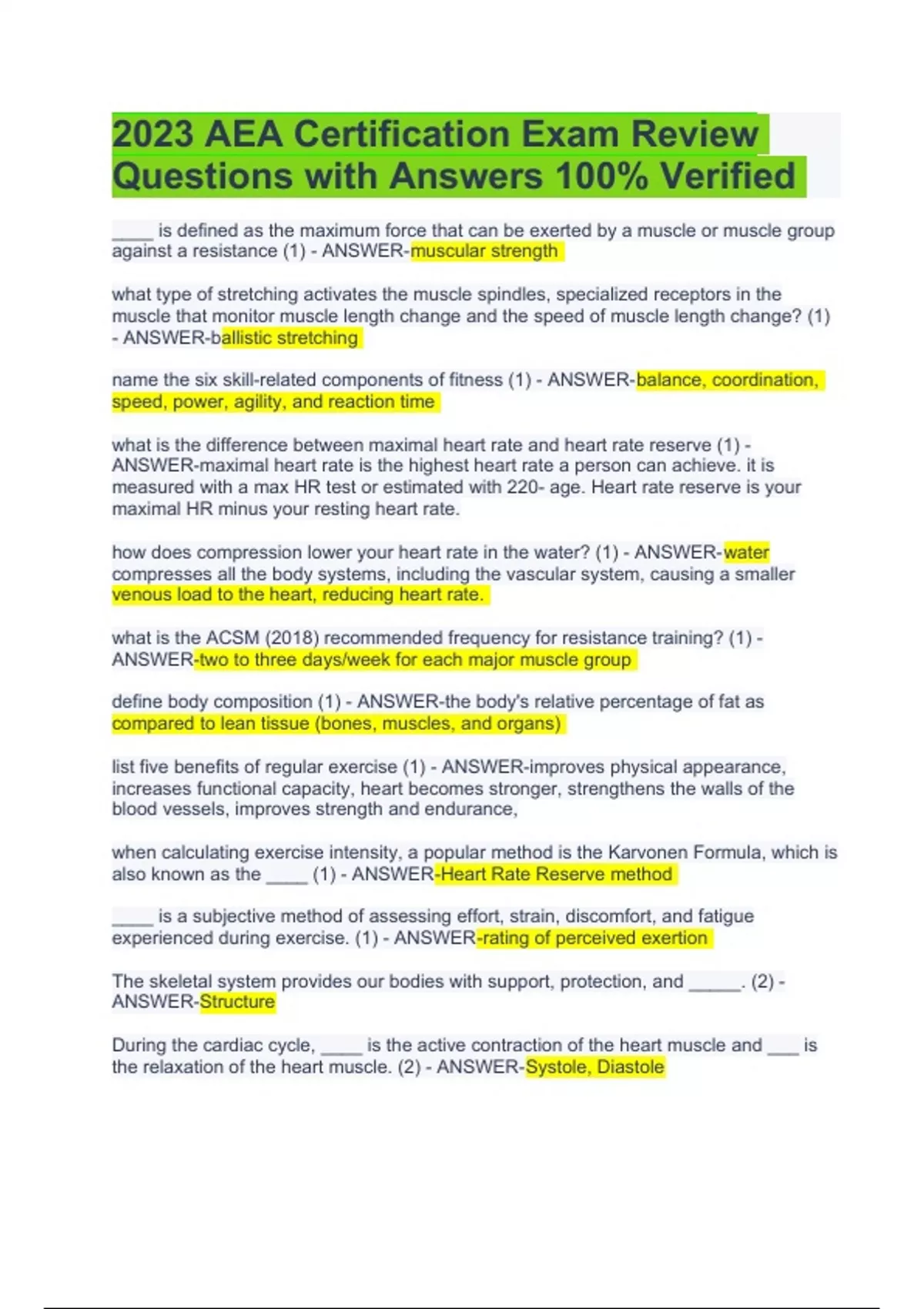 2023 AEA Certification Exam Review Questions with Answers 100% Verified. what type of stretching activates the muscle spindles, specialized receptors in the muscle that monitor muscle length change and the speed of muscle length change? (1) - ANSWER-ballistic stretching name the six skill-related components of fitness (1) - ANSWER-balance, coordination, speed, power, agility, and reaction time what is the difference between maximal heart rate and heart rate reserve (1) - ANSWER-maximal heart rate is the highest heart rate a person can achieve. it is measured with a max HR test or estimated with 220- age. Heart rate reserve is your maximal HR minus your resting heart rate. how does compression lower your heart rate in the water? (1) - ANSWER-water compresses all the body systems, including the vascular system, causing a smaller venous load to the heart, reducing heart rate. what is the ACSM (2018) recommended frequency for resistance training? (1) - ANSWER-two to three days/week for each major muscle group define body composition (1) - ANSWER-the body's relative percentage of fat as compared to lean tissue (bones, muscles, and organs) list five benefits of regular exercise (1) - ANSWER-improves physical appearance, increases functional capacity, heart becomes stronger, strengthens the walls of the blood vessels, improves strength and endurance, when calculating exercise intensity, a popular method is the Karvonen Formula, which is also known as the ____ (1) - ANSWER-Heart Rate Reserve method ____ is a subjective method of assessing effort, strain, discomfort, and fatigue experienced during exercise. (1) - ANSWER-rating of perceived exertion The skeletal system provides our bodies with support, protection, and _____. (2) - ANSWER-Structure During the cardiac cycle, ____ is the active contraction of the heart muscle and ___ is the relaxation of the heart muscle. (2) - ANSWER-Systole, Diastole Which characteristic of muscle allows it to shorten and thicken (2) - ANSWERContractility The ____ muscle group flexes the leg at the knee. (2) - ANSWER-Hamstrings What is a motor neuron (2) - ANSWER-Efferent neurons that relay outgoing information from the central nervous system to the muscle cells Describe the valsalva maneuver (2) - ANSWER-Holding one's breath while exerting. Creates unequal pressure in the chest, causing blood pressure to drop and decreasing blood flow to the heart. Resuming normal breathing creates a surge of blood flow to the heart, causing a sharp increase in blood pressure. Name the 5 systems of the body most actively involved in movement and exercise (2) - ANSWER-Skeletal, muscular, nervous, respiratory, and cardiovascular systems In a muscle pair, the muscle that is actively contracting is referred to as the ____, or prime mover (2) - ANSWER-Agonist List the three types of muscle tissues in the human body (2) - ANSWER-Visceral, cardiac, and skeletal The process by which bones grow in the body is called ____ (2) - ANSWER-Ossification ____ states that you train only that part of the system or body that is overloaded (3) - ANSWER-Specificity Muscle balance should be considered for the front and back, left and right sides, and ____ parts of the body (3) - ANSWER-Upper and Lower Which metabolic system yields the highest amount of ATP for the working muscles? (3) - ANSWER-Oxidative system Recovery pertains to two segments of training: recovery ____ exercise and recovery ____ an exercise session. (3) - ANSWER-During; after List 5 physical and psychological symptoms that commonly accompany overtraining (3) - ANSWER-Reduction in performance and coordination, elevated resting heart rate and blood pressure, loss of appetite, soreness, increased illness or infection, as well as issues with sleep, depression, and a reduced self-esteem Which type of muscle tissue is best suited for endurance activities? (3) - ANSWER-slow twitch Concentric and eccentric muscle actions are part of a(n) _____ muscle contraction (3) - ANSWER-Isotonic