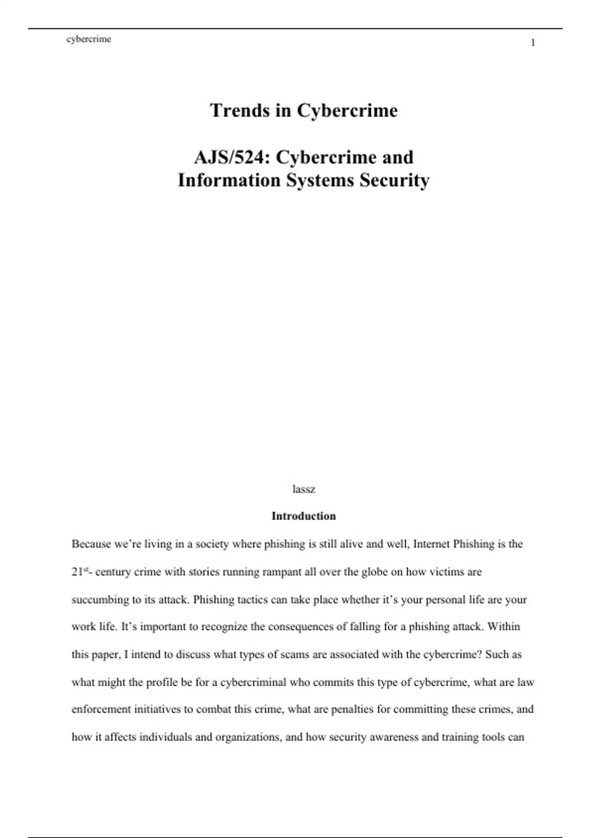 Trends in Cybercrime AJS/524: Cybercrime and Information Systems Security