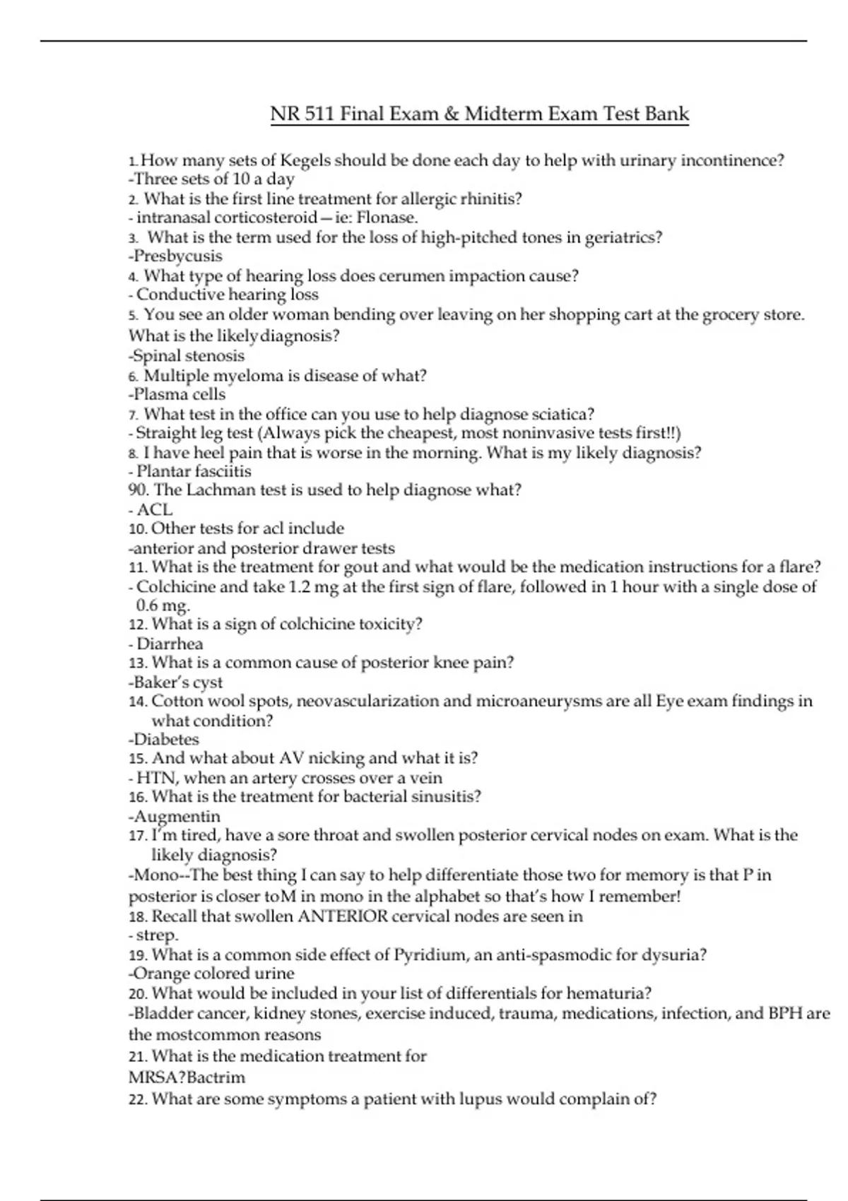 NR 511 Final Exam & Midterm Exam Test Bank.1. How many sets of Kegels should be done each day to help with urinary incontinence? -Three sets of 10 a day 2. What is the first line treatment for allergic rhinitis? - intranasal corticosteroid—ie: Flonase. 3. What is the term used for the loss of high-pitched tones in geriatrics? -Presbycusis 4. What type of hearing loss does cerumen impaction cause? - Conductive hearing loss 5. You see an older woman bending over leaving on her shopping cart at the grocery store. What is the likely diagnosis? -Spinal stenosis 6. Multiple myeloma is disease of what? -Plasma cells 7. What test in the office can you use to help diagnose sciatica? - Straight leg test (Always pick the cheapest, most noninvasive tests first!!) 8. I have heel pain that is worse in the morning. What is my likely diagnosis? - Plantar fasciitis 90. The Lachman test is used to help diagnose what? - ACL 10. Other tests for acl include -anterior and posterior drawer tests 11. What is the treatment for gout and what would be the medication instructions for a flare? - Colchicine and take 1.2 mg at the first sign of flare, followed in 1 hour with a single dose of 0.6 mg. 12. What is a sign of colchicine toxicity? - Diarrhea 13. What is a common cause of posterior knee pain? -Baker’s cyst 14. Cotton wool spots, neovascularization and microaneurysms are all Eye exam findings in what condition? -Diabetes 15. And what about AV nicking and what it is? - HTN, when an artery crosses over a vein 16. What is the treatment for bacterial sinusitis? -Augmentin 17. I’m tired, have a sore throat and swollen posterior cervical nodes on exam. What is the likely diagnosis? -Mono--The best thing I can say to help differentiate those two for memory is that P in posterior is closer to M in mono in the alphabet so that’s how I remember! 18. Recall that swollen ANTERIOR cervical nodes are seen in - strep. 19. What is a common side effect of Pyridium, an anti-spasmodic for dysuria?